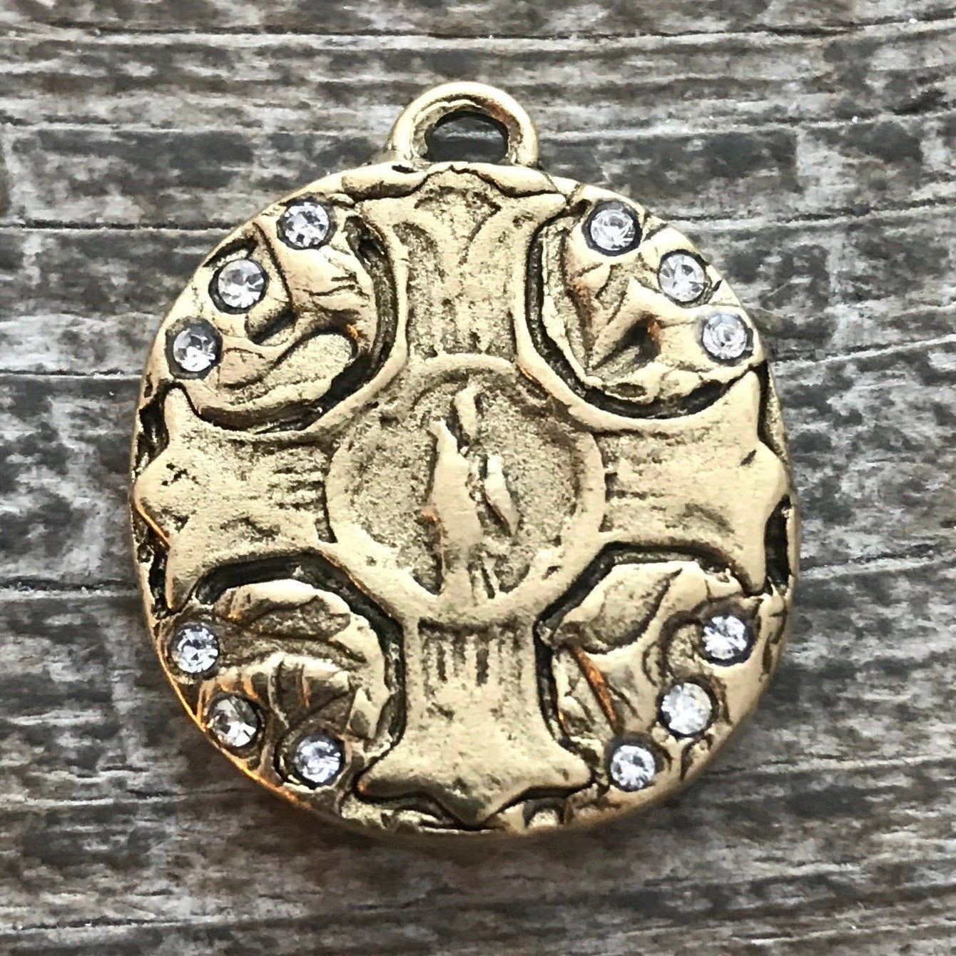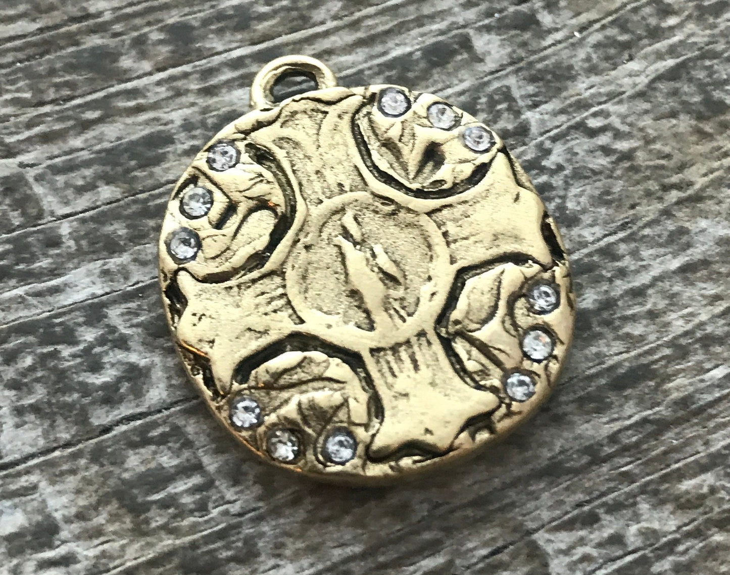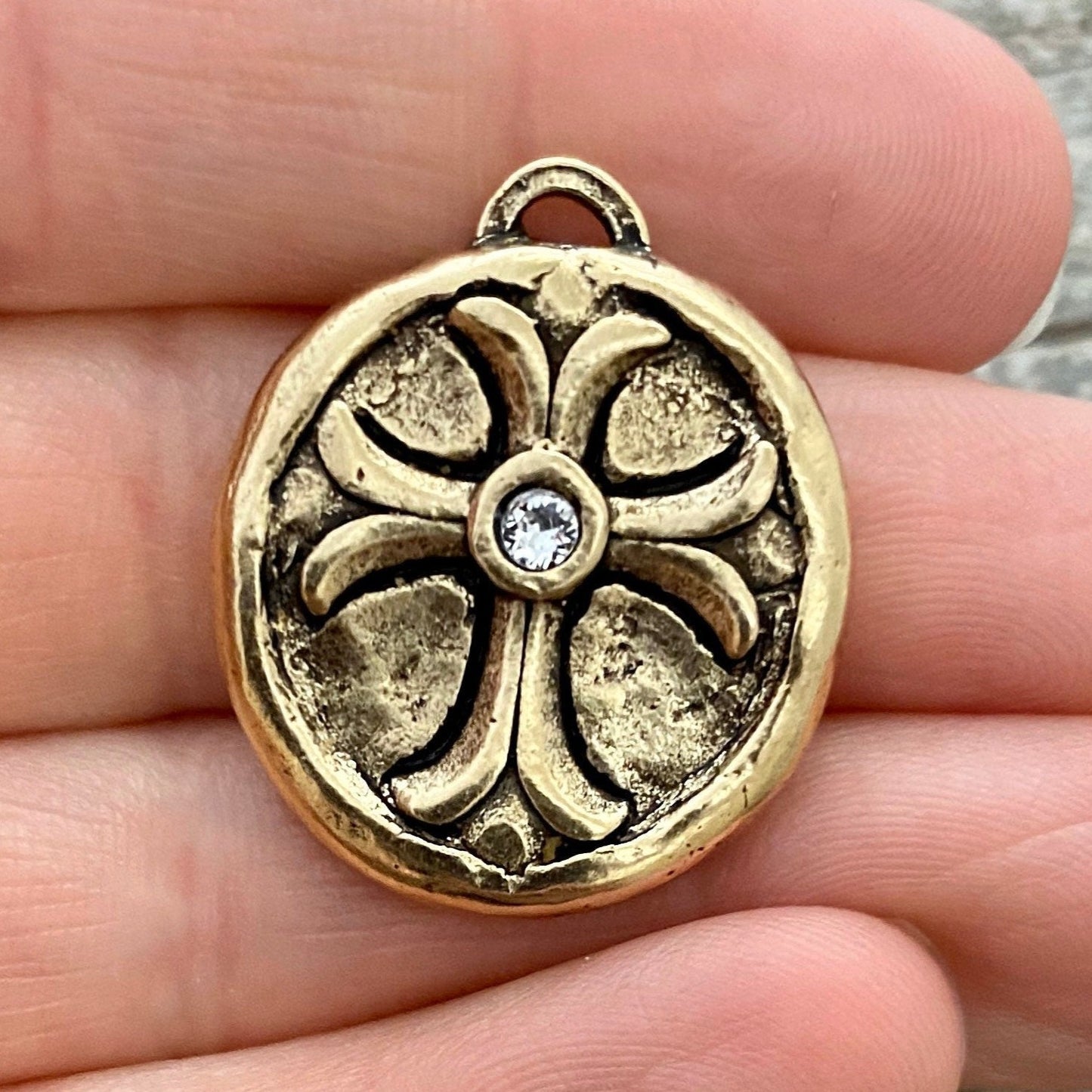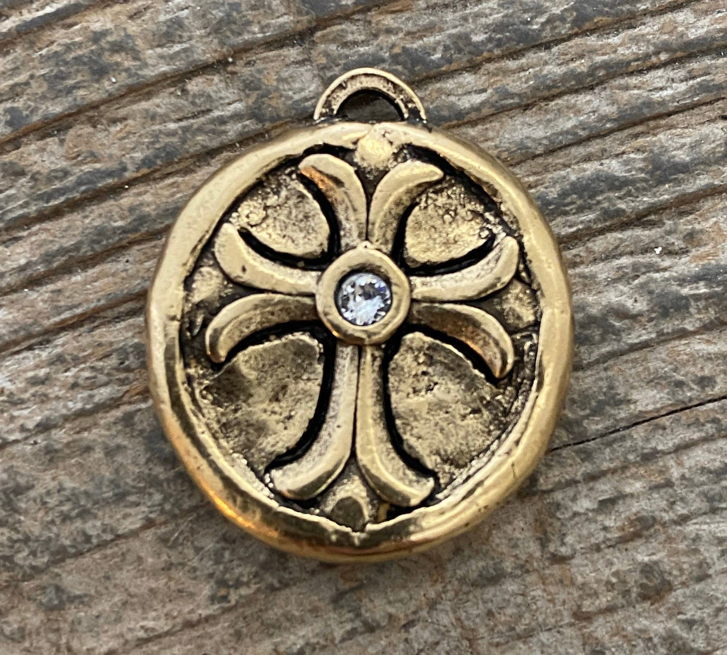 Swarovski Crystal Antiqued Gold Cross Charm, Wax Seal Style Pendant, Rhinestone Jewelry Making, Artisan Findings, GL-6169