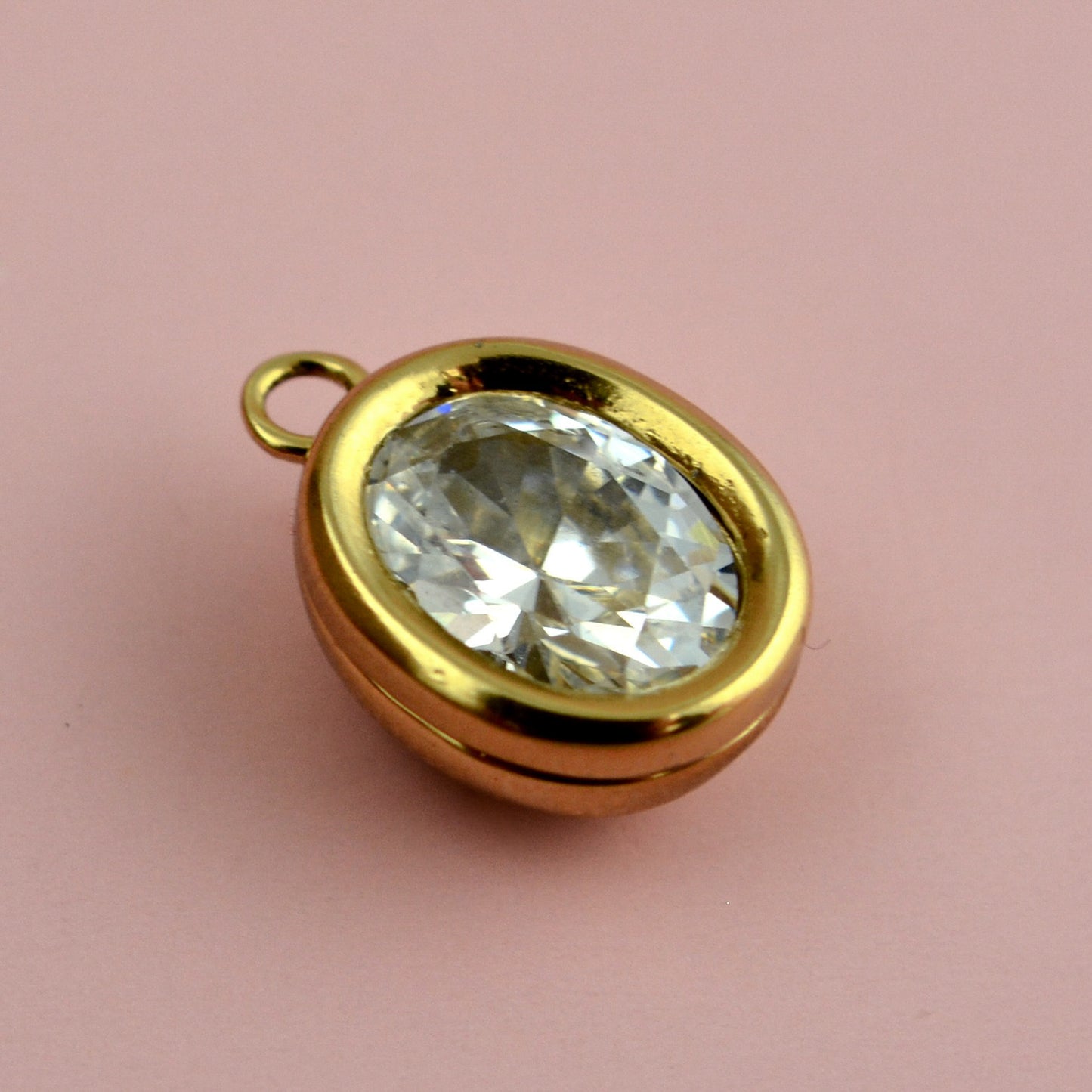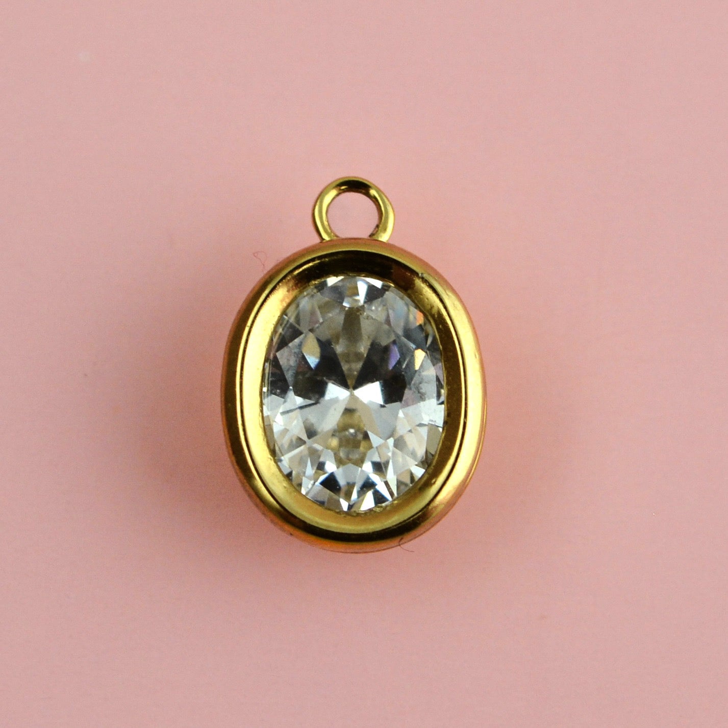 Crystal Clear Oval Shape CZ Charm, Small Round Sparkling Gold Pendant, Rhinestone Minimal Jewelry Making Artisan Findings, GL-6371