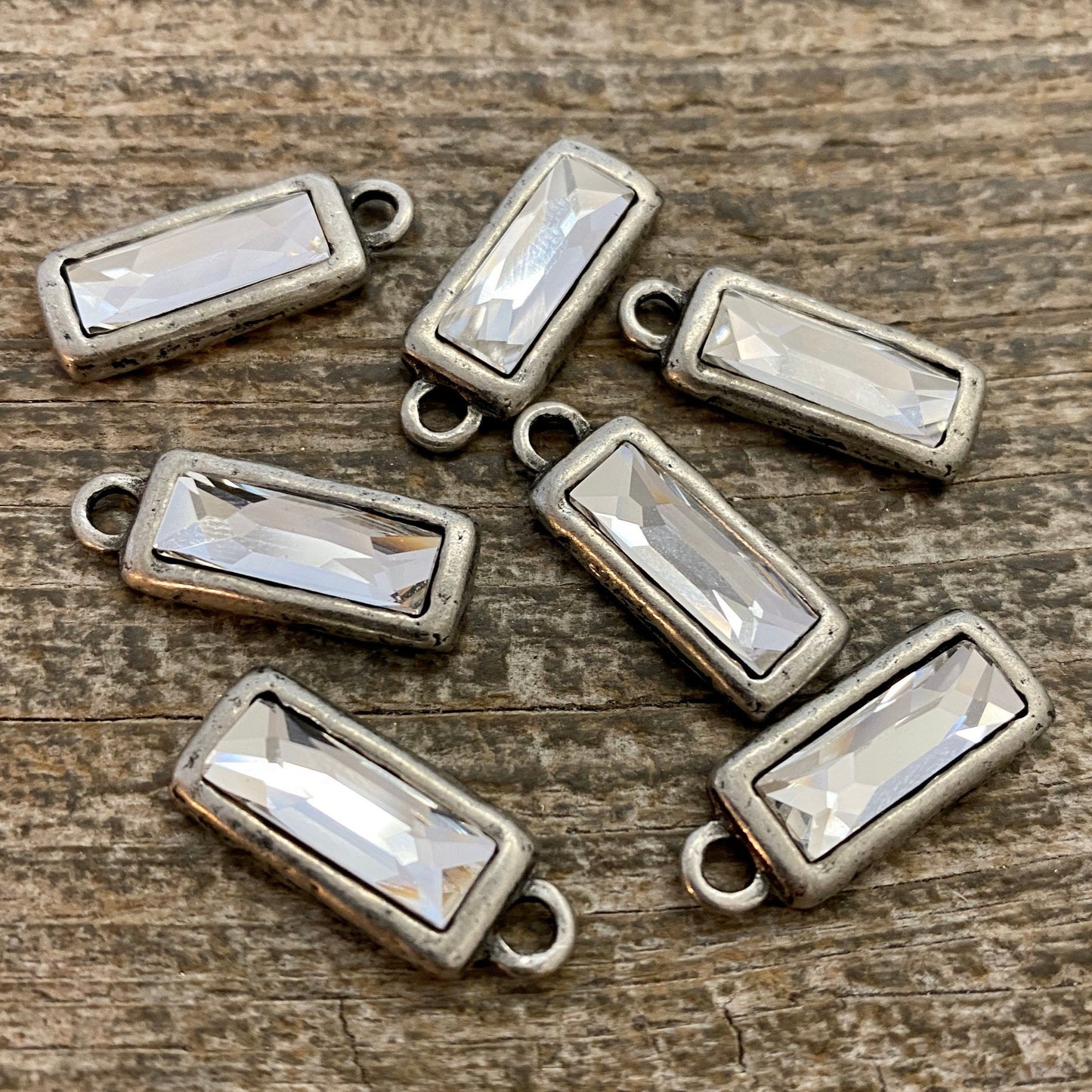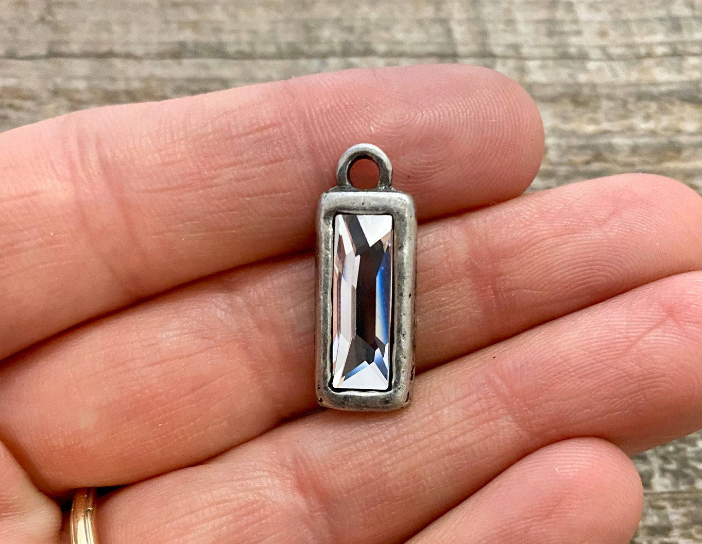 Large Rhinestone Crystal Cosmic Baguette Clear Charm, Antiqued Silver Rectangle Pendant, Jewelry Making Artisan Findings, PW-S010