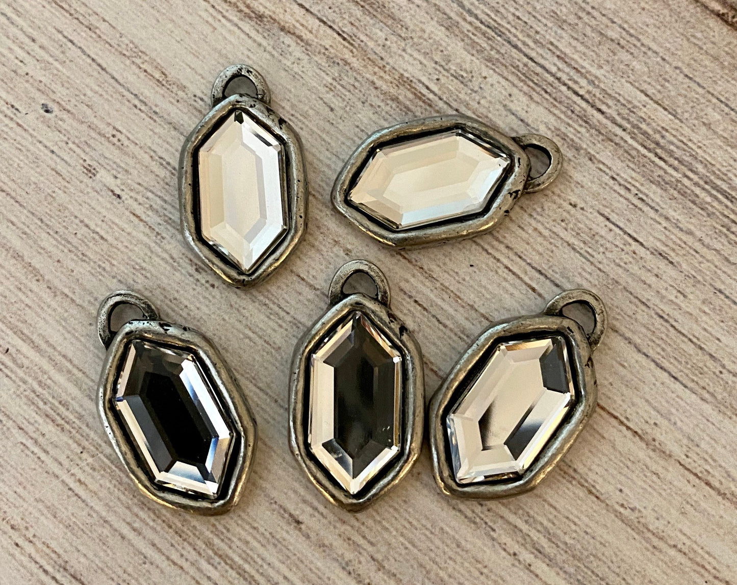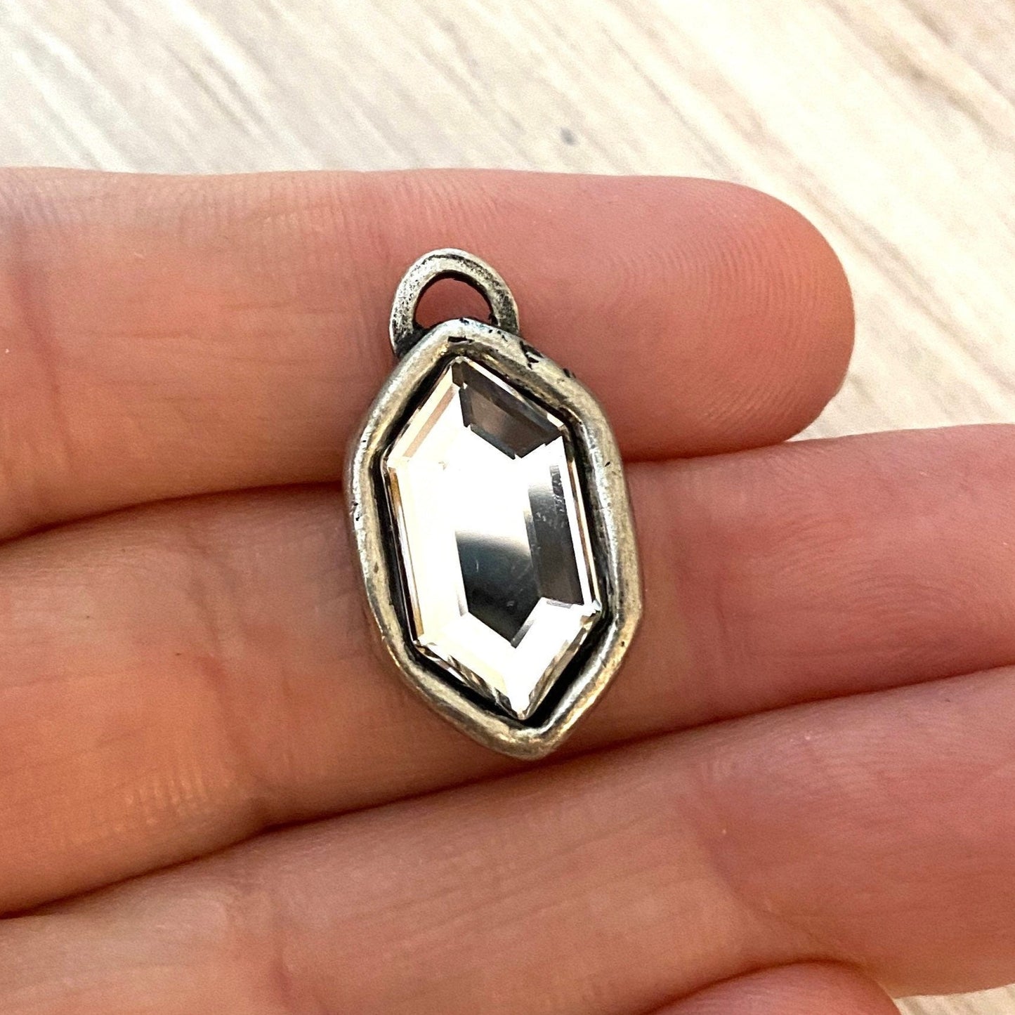 Swarovski Crystal Clear Hexagon Charm, Antiqued Silver Rhinestone Pendant, Jewelry Making Artisan Findings, PW-S013