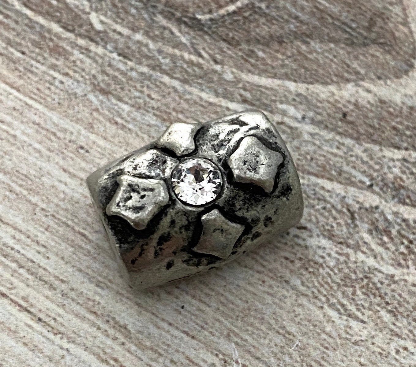 Large Artisan Barrel Bead with Swarovski Crystal Rhinestone, Antiqued Silver Pewter Cross Flower Slider Jewelry Components Supplies, PW-6116