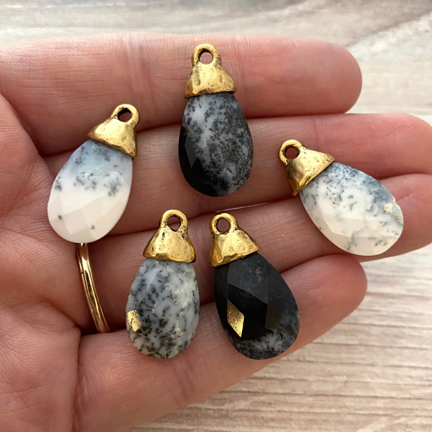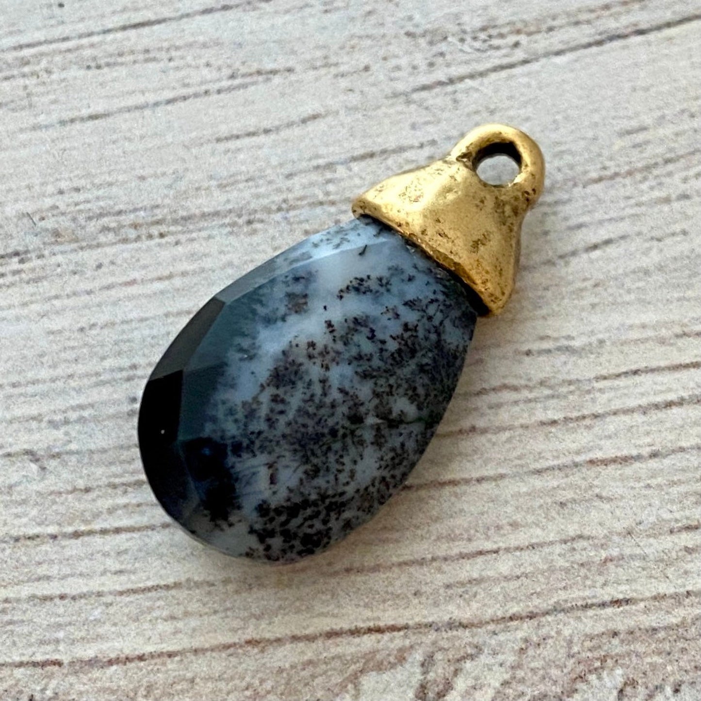 Dendritic Opal Faceted Pear Briolette Drop Pendant with Gold Pewter Bead Cap, Jewelry Making Artisan Findings, GL-S020