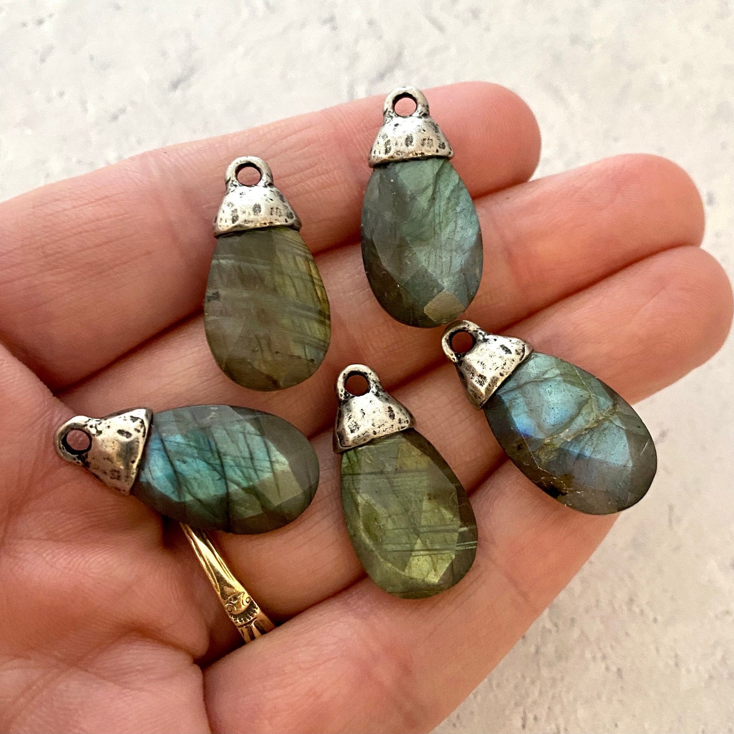 Add Labradorite Pear Faceted Briolette Drop Pendant with Silver Pewter Bead Cap, Jewelry Making Artisan Findings, PW-S021 to the cart