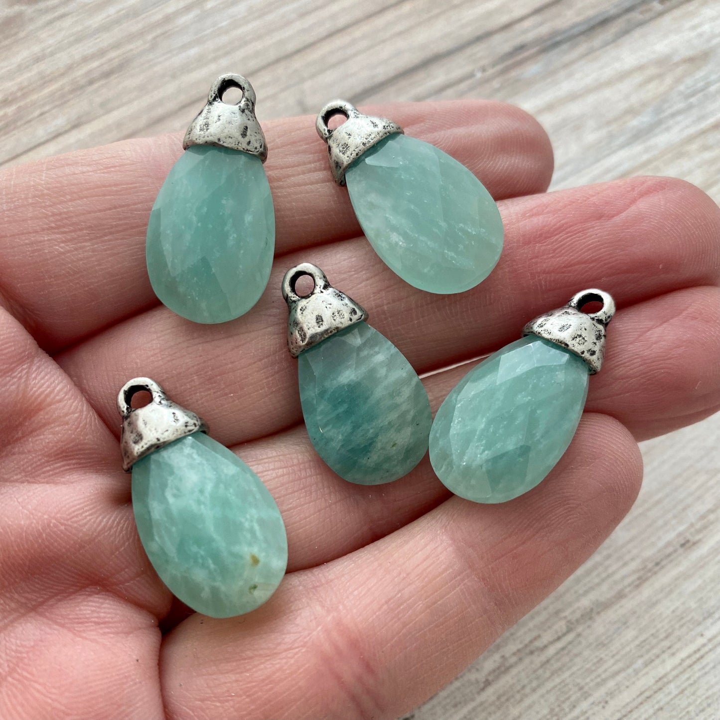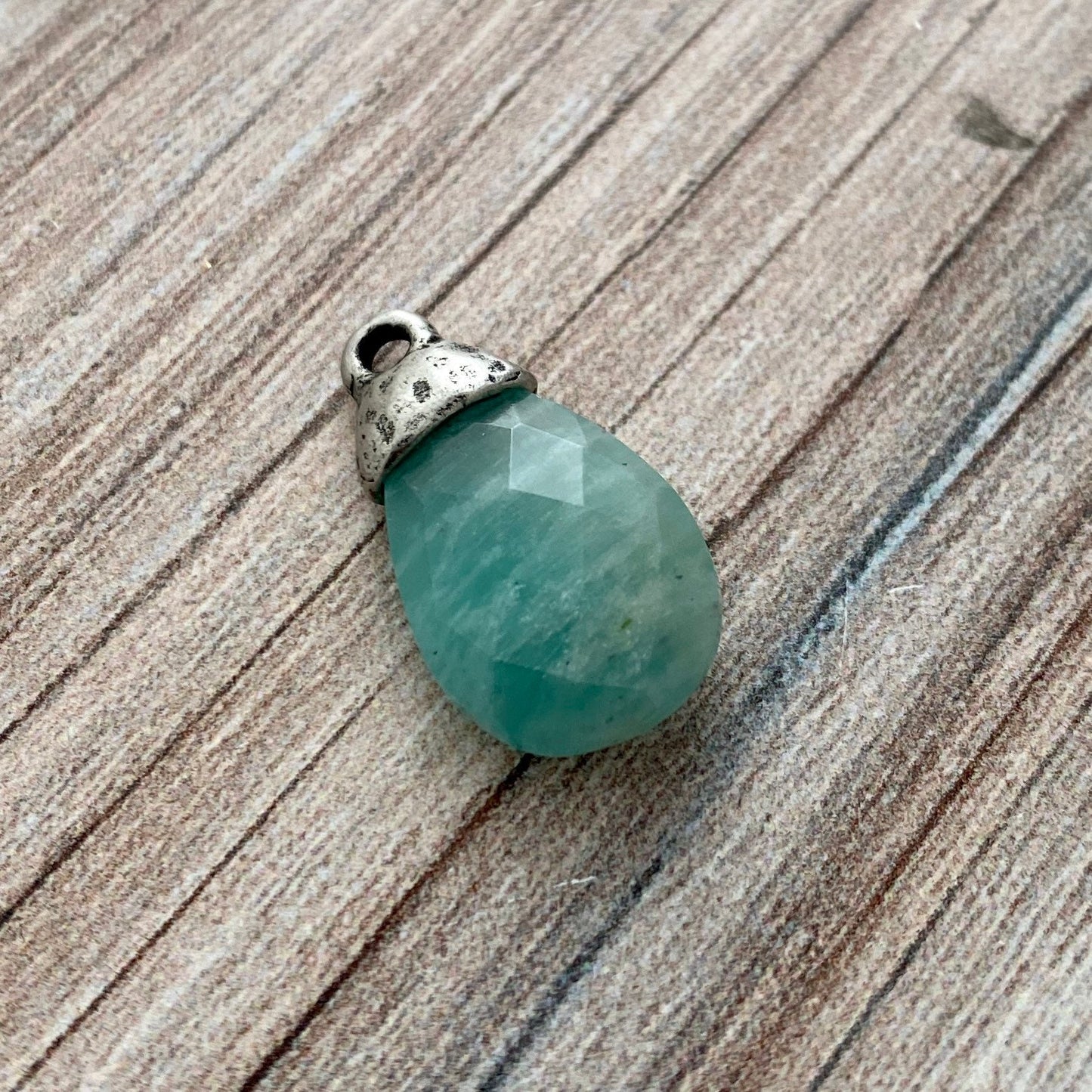 Amazonite Pear Faceted Briolette Drop Pendant with Silver Pewter Bead Cap, Jewelry Making Artisan Findings, PW-S023