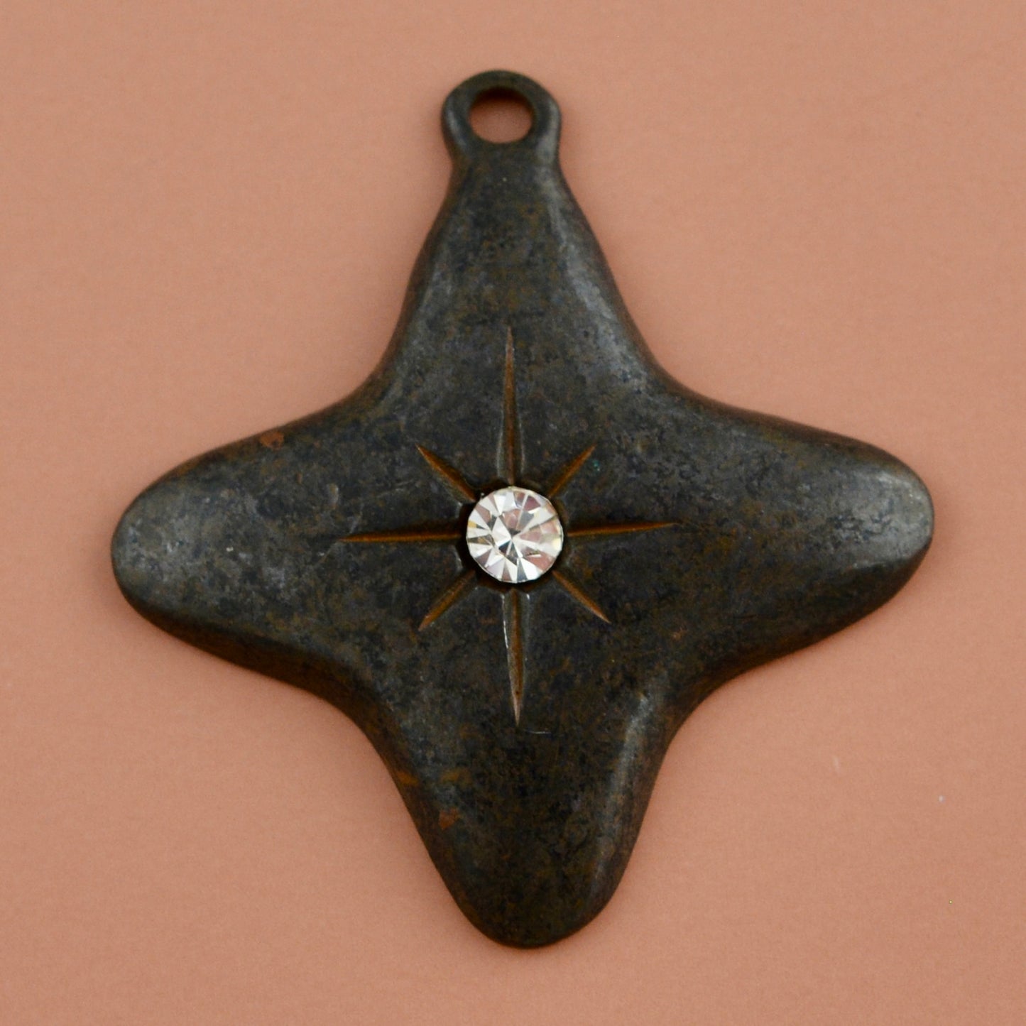 Smooth Rounded Twinkling Star Charm with Rhinestone Crystal, Rustic Brown Modern Pendant, Jewelry Making BR-6337