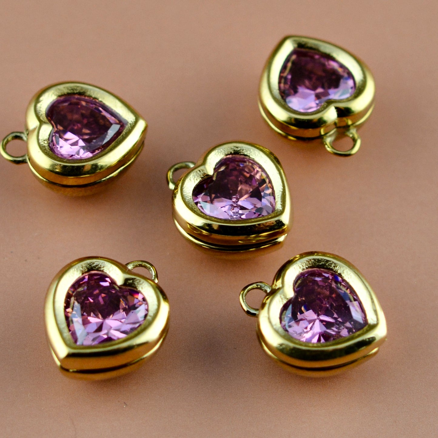 Pink Crystal Heart Shape CZ Charm, Small Sparkling Gold Pendant, Rhinestone, Jewelry Making Artisan Findings, GL-6385