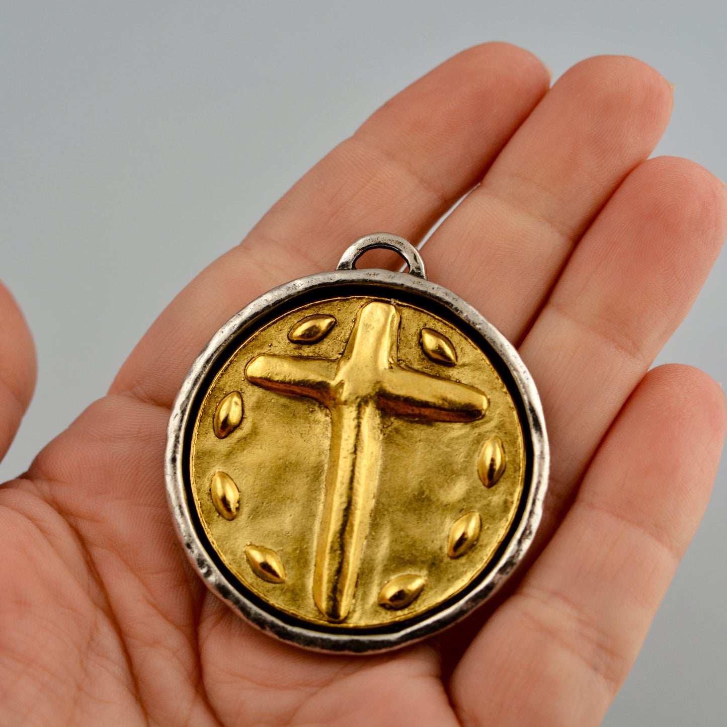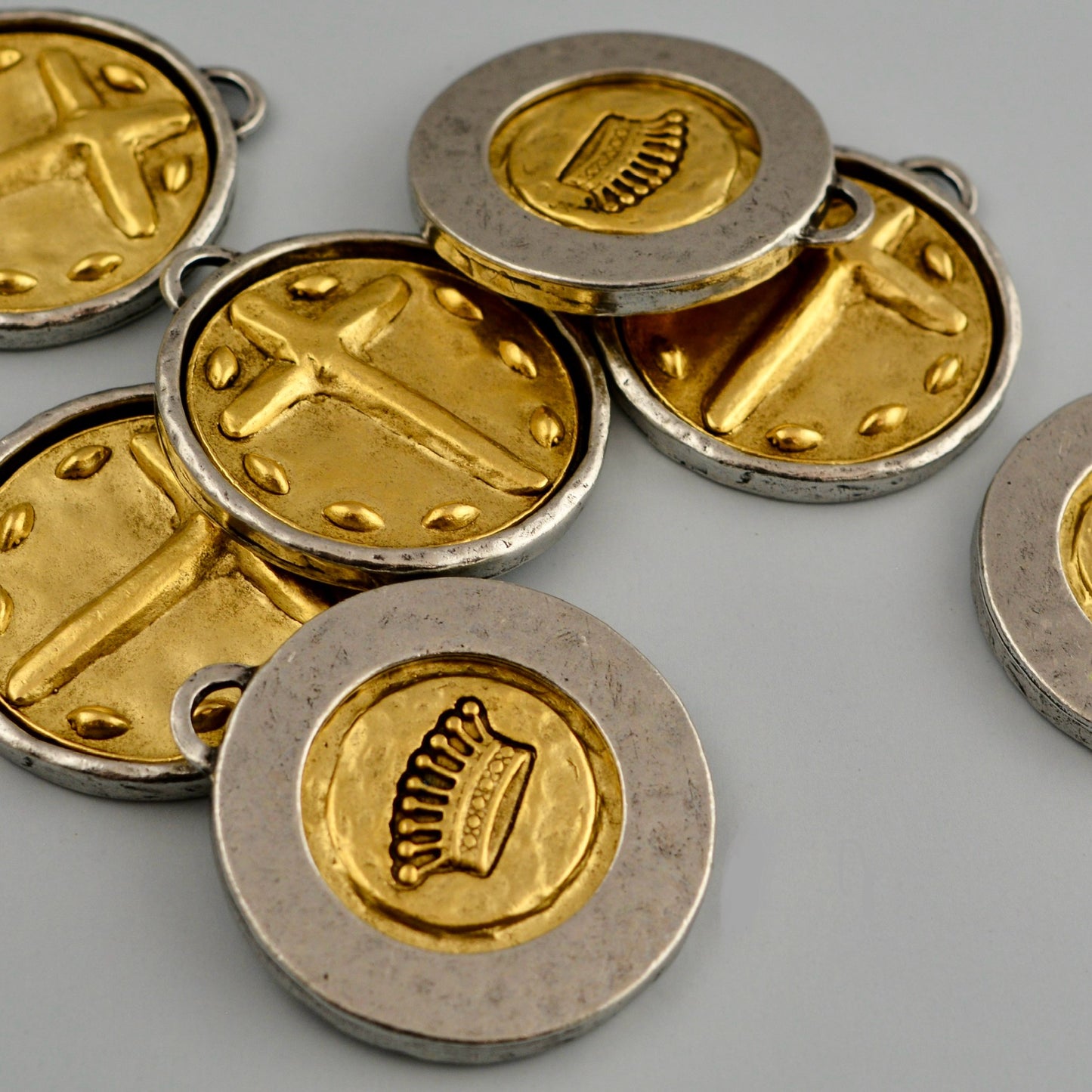 Mixed Metal Cross Coin Pendant, Large Silver and Gold Crown Coin, Jewelry Making Supplies, GL-6388