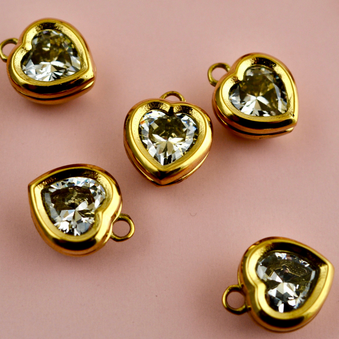 Crystal Clear Heart Shape CZ Charm, Small Sparkling Gold Pendant, Rhinestone, Jewelry Making Artisan Findings, GL-6384