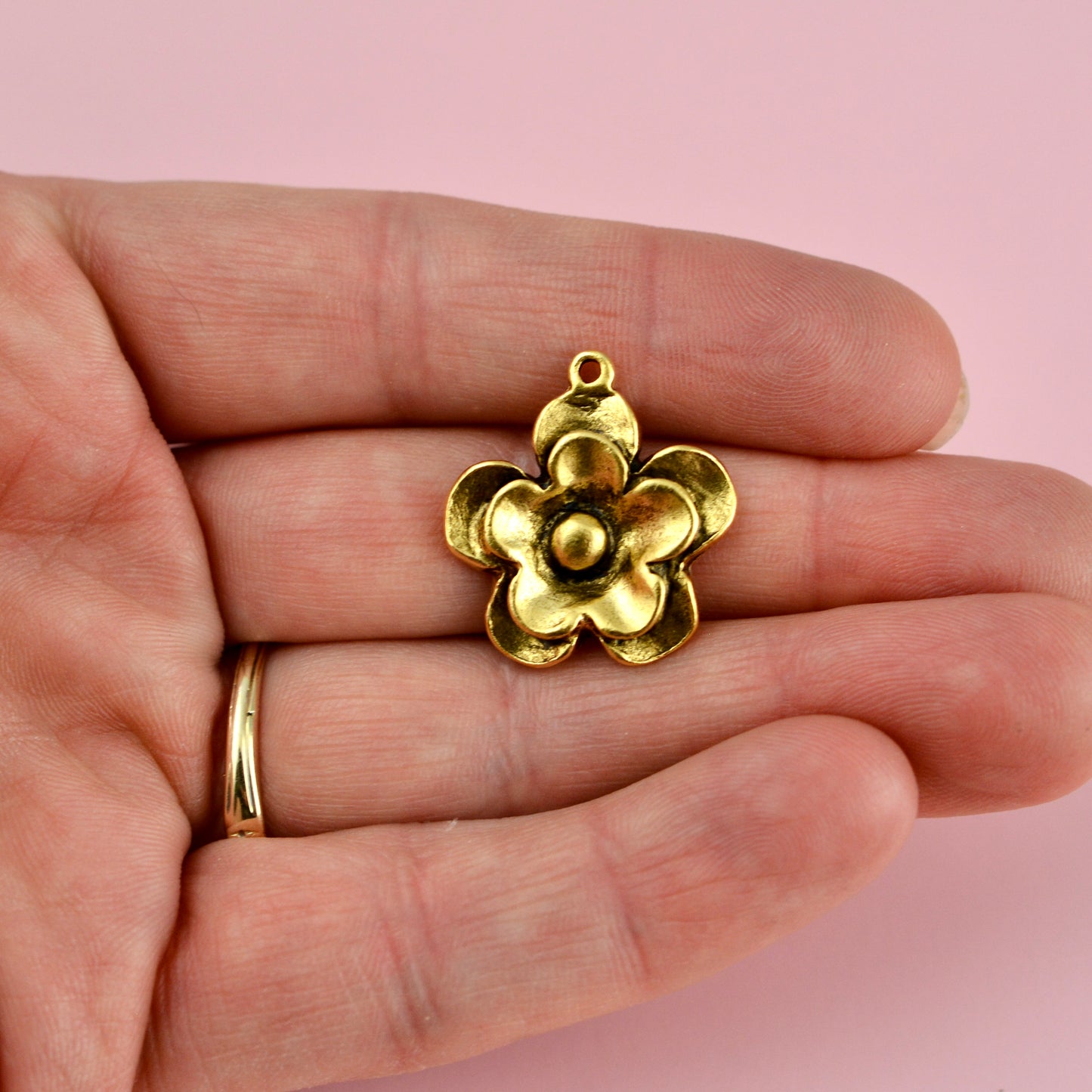 Capture the spirit of the 60's flower child era with this gold Flower Power charm. Perfect for jewelry making, this vintage-inspired pendant adds nostalgic charm and optimism to your creations. It's an ideal accent for bracelets, necklaces, or earrings that celebrate peace and love.