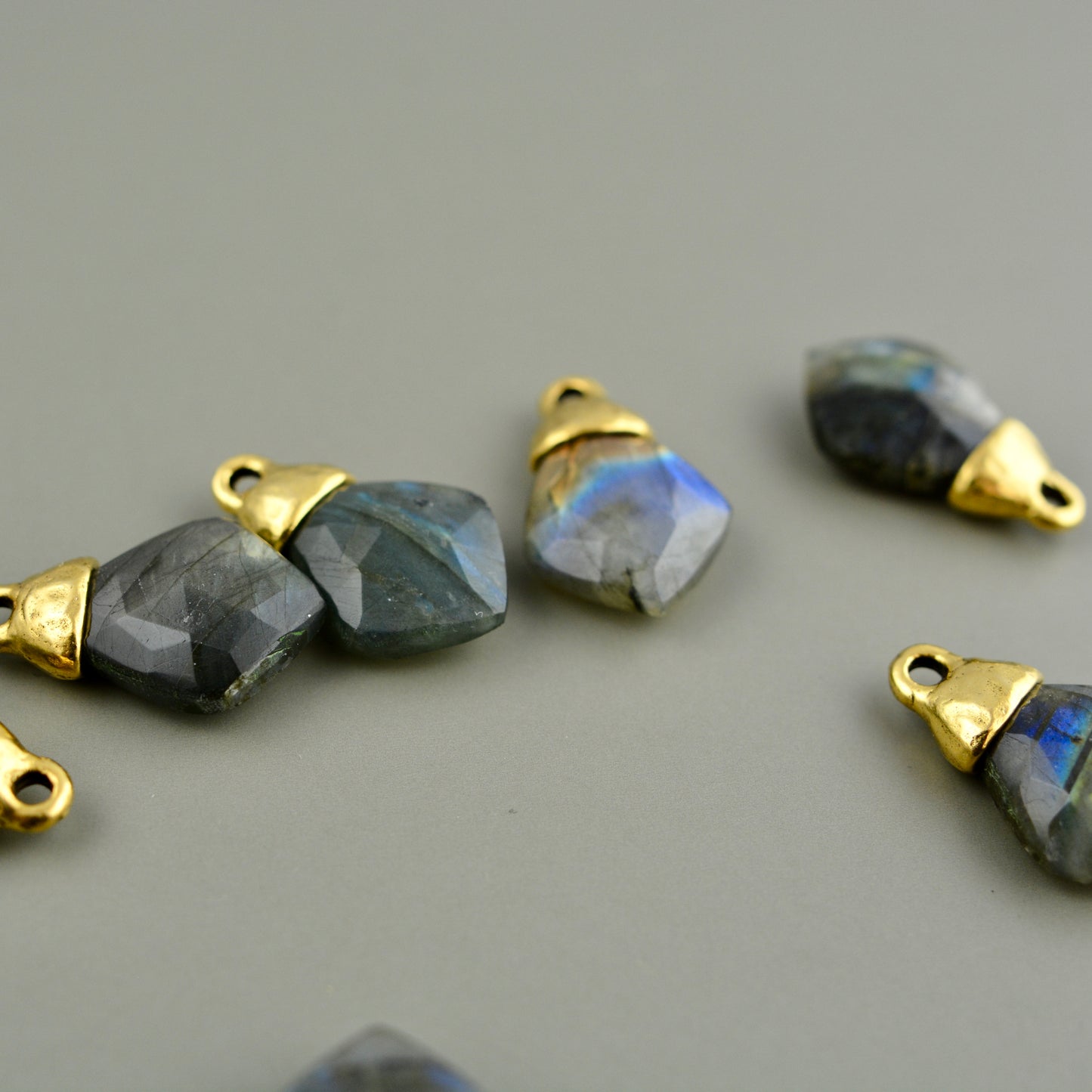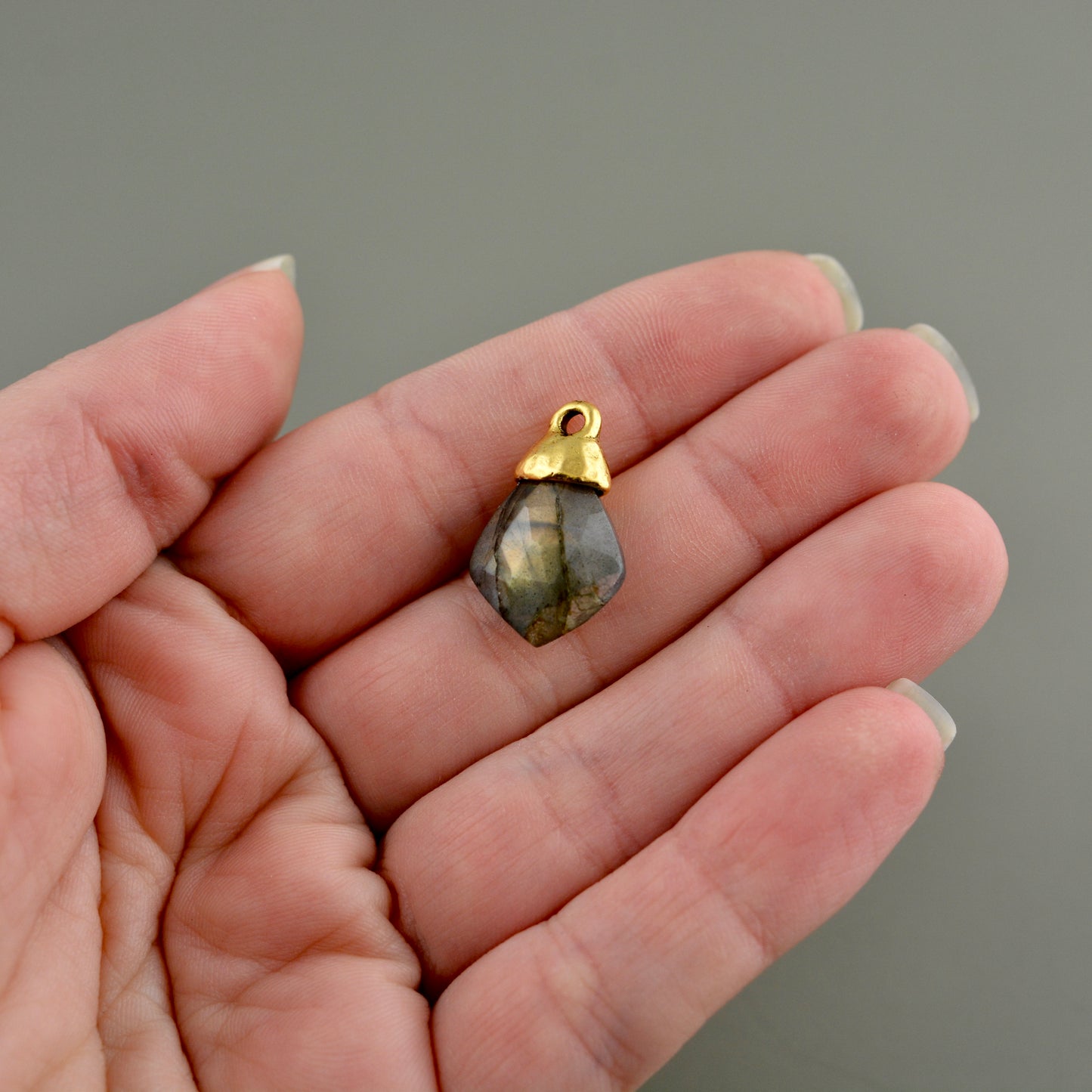 Add brilliance to your jewelry creations with this captivating labradorite pendant. Cut into a striking diamond shape, this gemstone showcases natural iridescent flashes that catch the light beautifully. The antique gold bead cap provides a sophisticated finishing touch that complements any design aesthetic. An excellent choice for artisan jewelry makers seeking quality findings to elevate their handcrafted pieces.