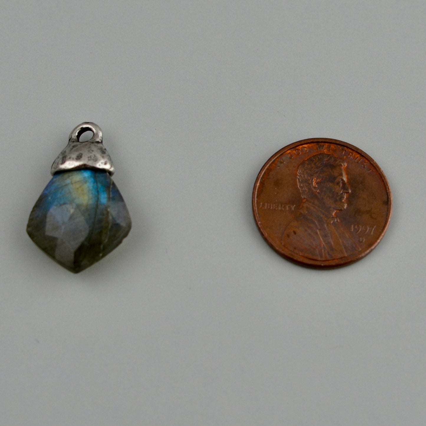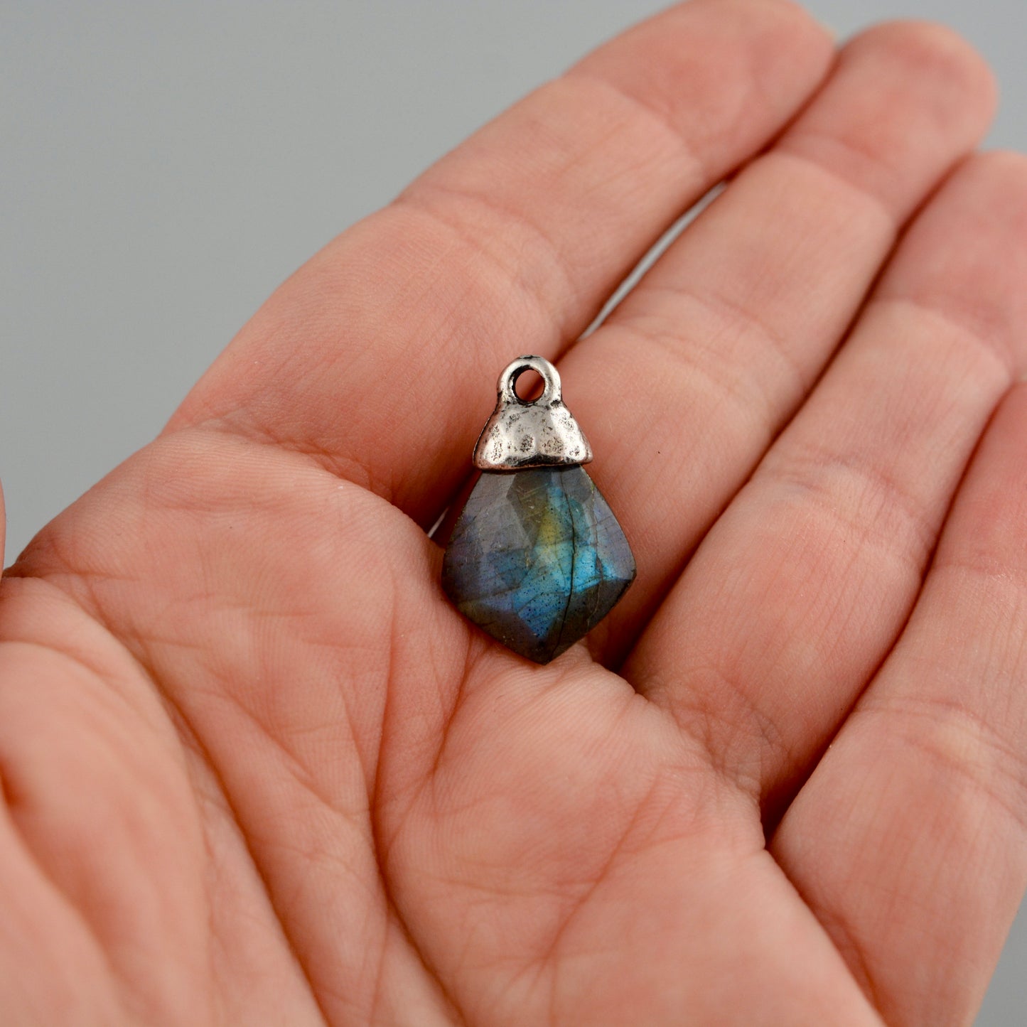 Add brilliance to your jewelry creations with this captivating labradorite pendant. Cut into a striking diamond shape, this gemstone showcases natural iridescent flashes that catch the light beautifully. The antique silver bead cap provides a sophisticated finishing touch that complements any design aesthetic. An excellent choice for artisan jewelry makers seeking quality findings to elevate their handcrafted pieces.