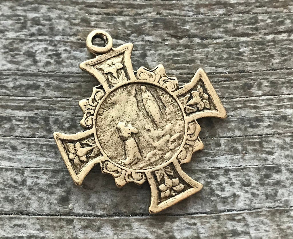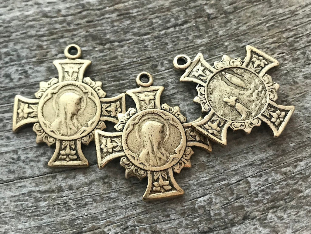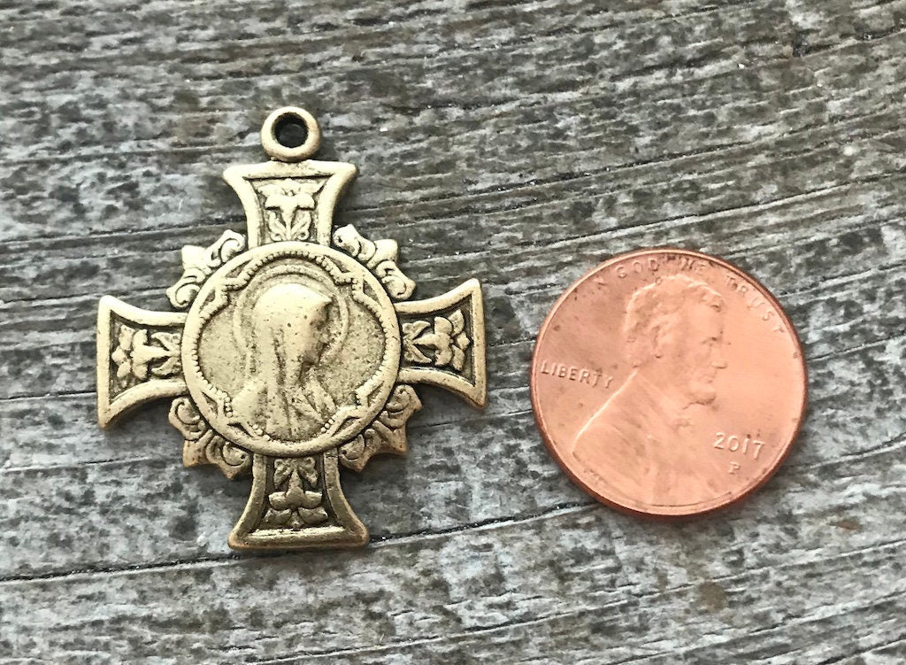 Mary Cross, Cross Pendant Medal, Antique Gold Cross, Gold Rosary Parts, Floral Cross, Catholic Jewelry Supply, Religious Jewelry, GL-6137