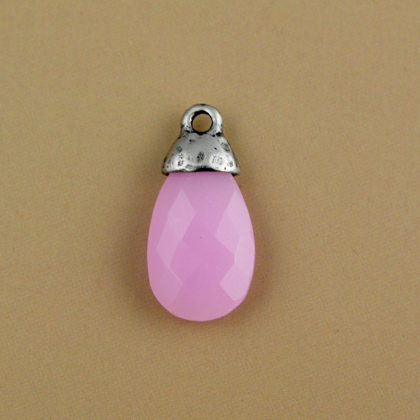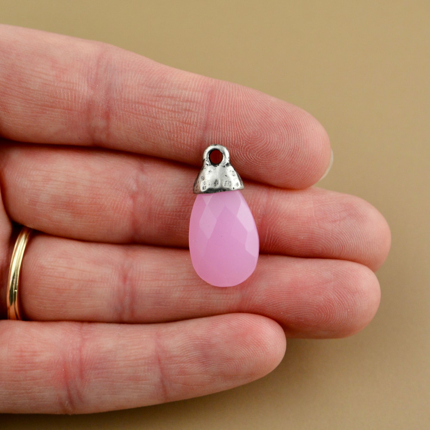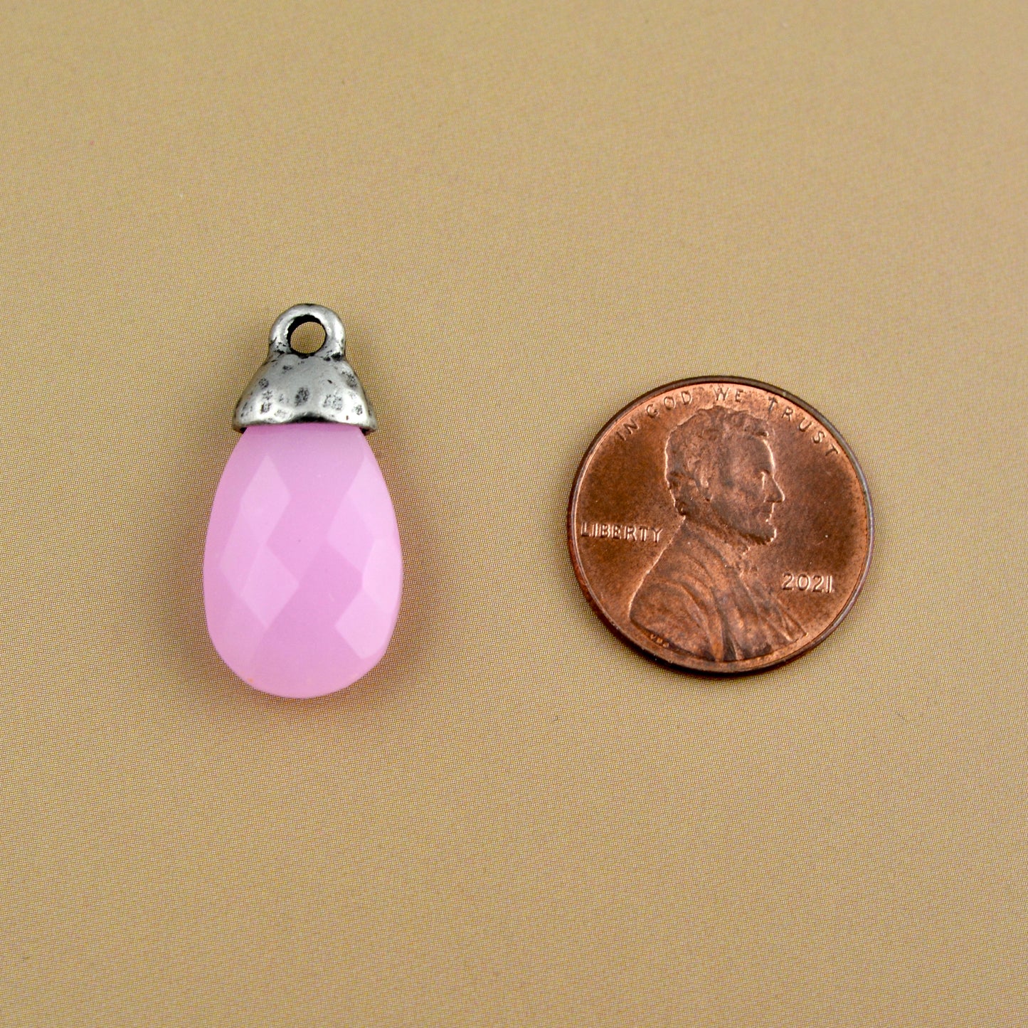 This pastel pink chalcedony quartz pendant features a delicate pear-shaped faceted briolette design, topped with an antique silver bead cap. Known for its calming and nurturing energy, chalcedony is believed to promote emotional balance and open-hearted communication. Perfect for jewelry making, this gemstone adds a soft, loving touch to any creation, inspiring positivity and gentle strength.