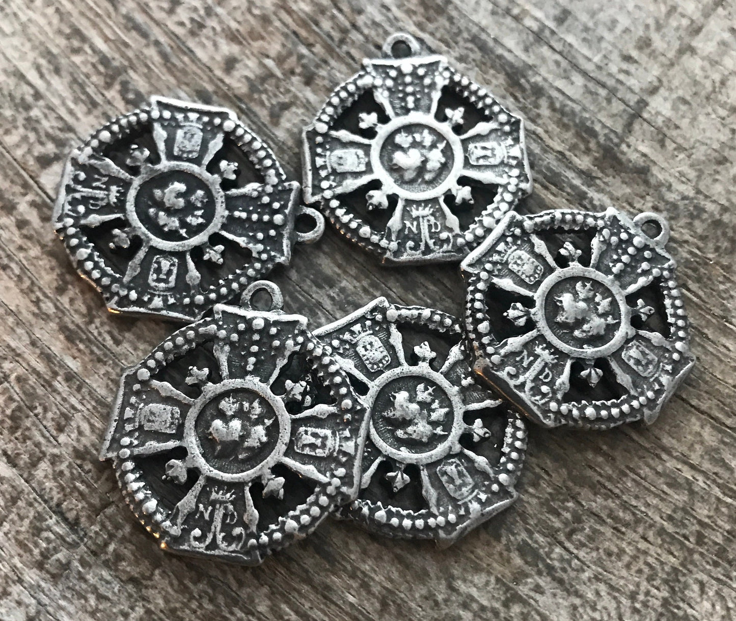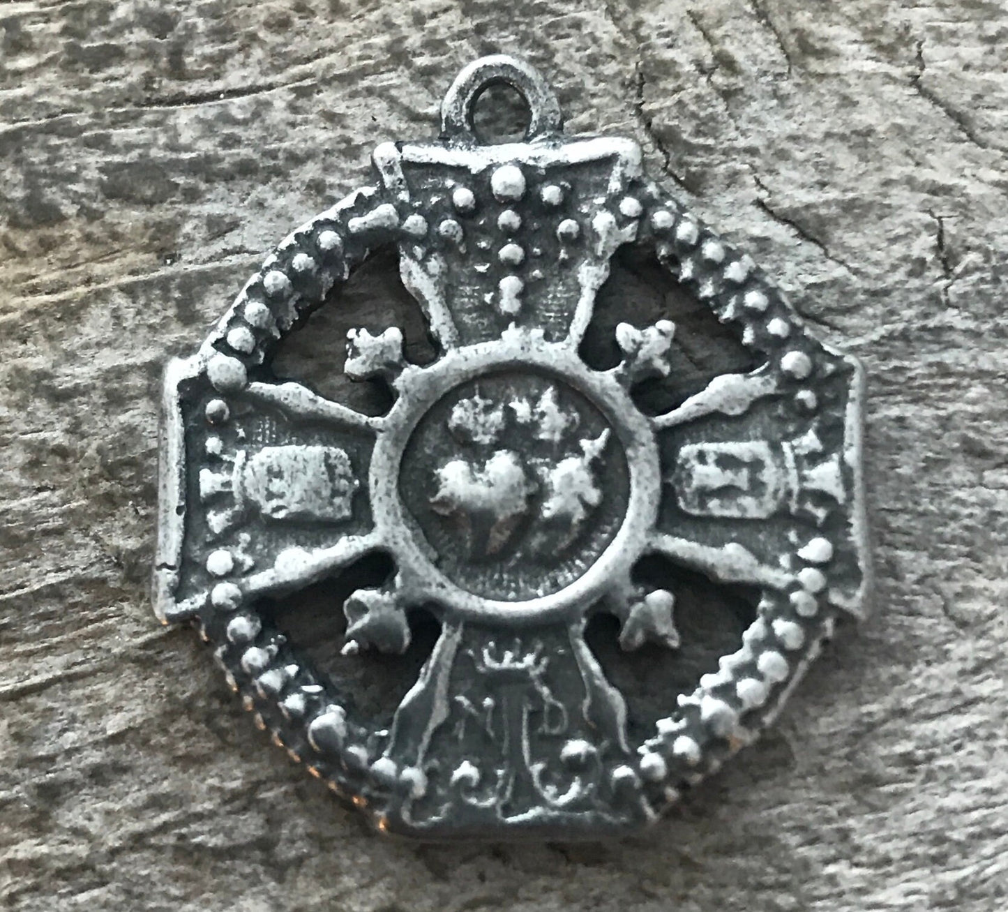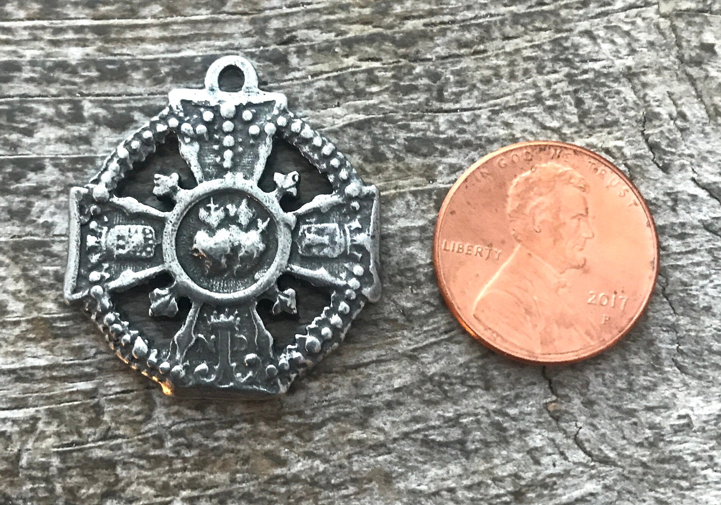 This medal is absolutely stunning. It features the Sacred and Immaculate Hearts in the middle of a cross. The sides of the cross depict "ND" (for Notre Dame), as well as different heraldry crests. This medal is double-sided - it's the same on the front and back. It's thick and solid.