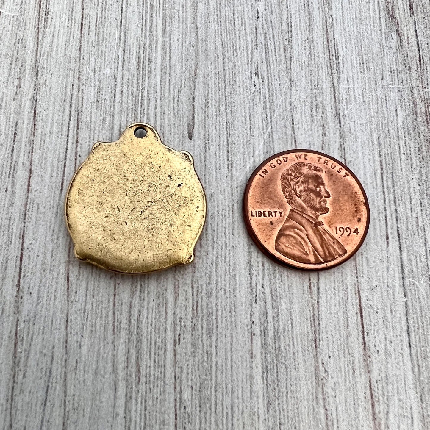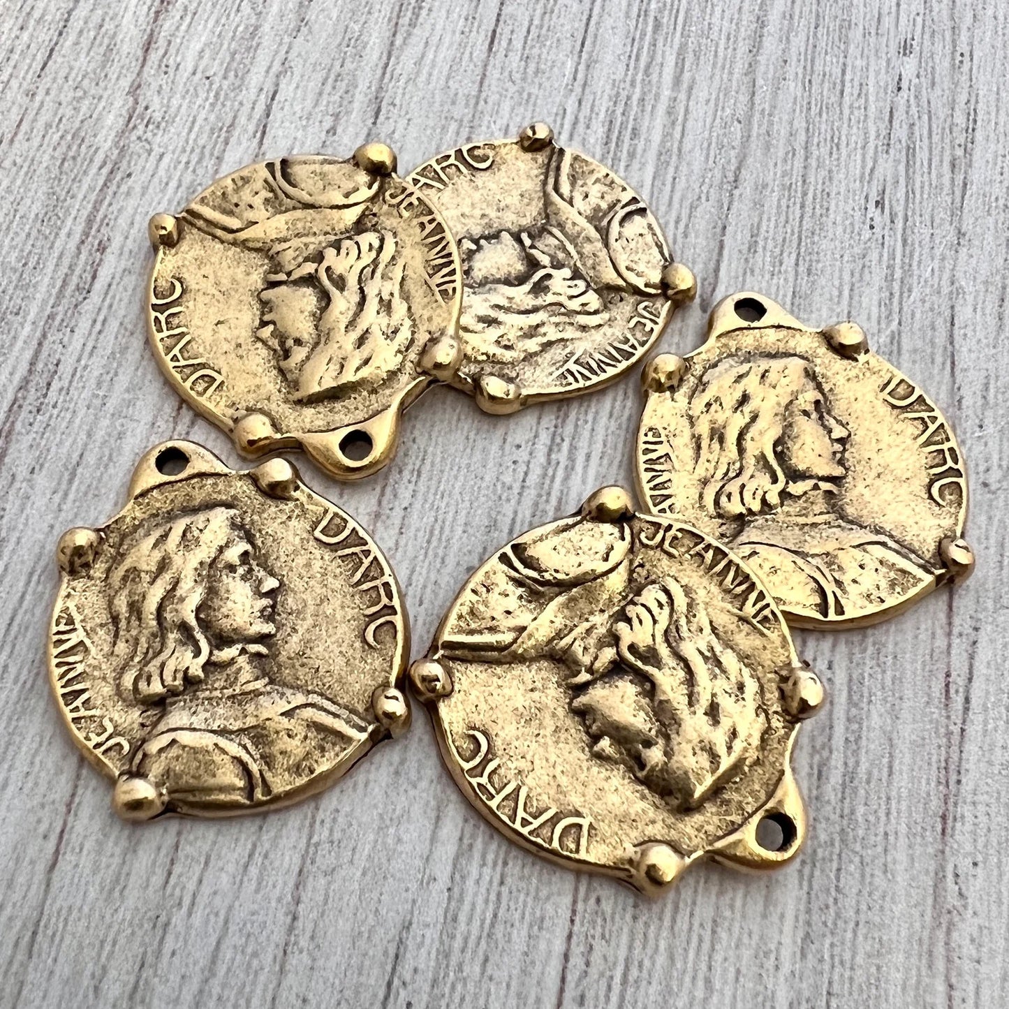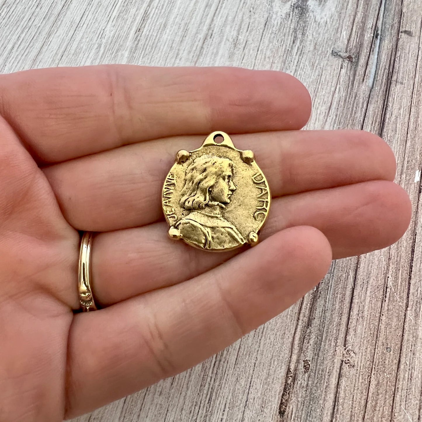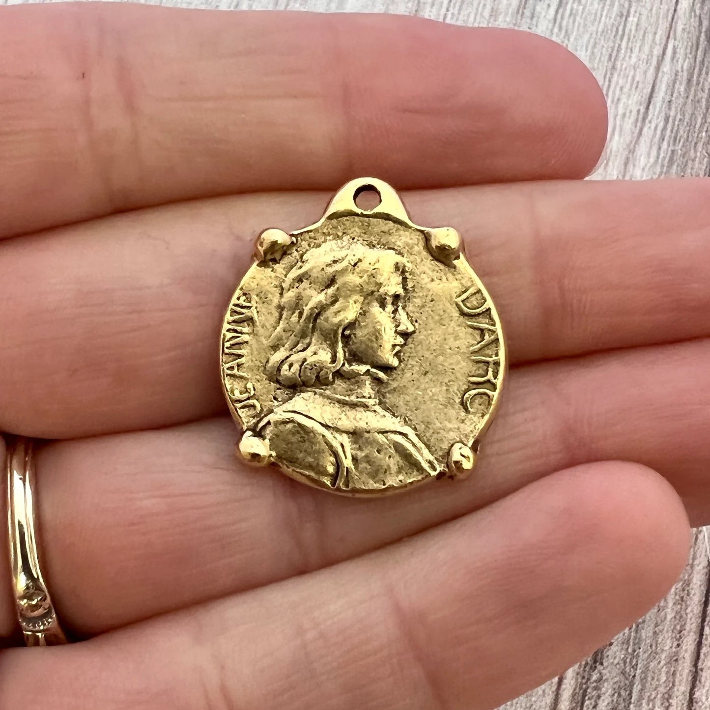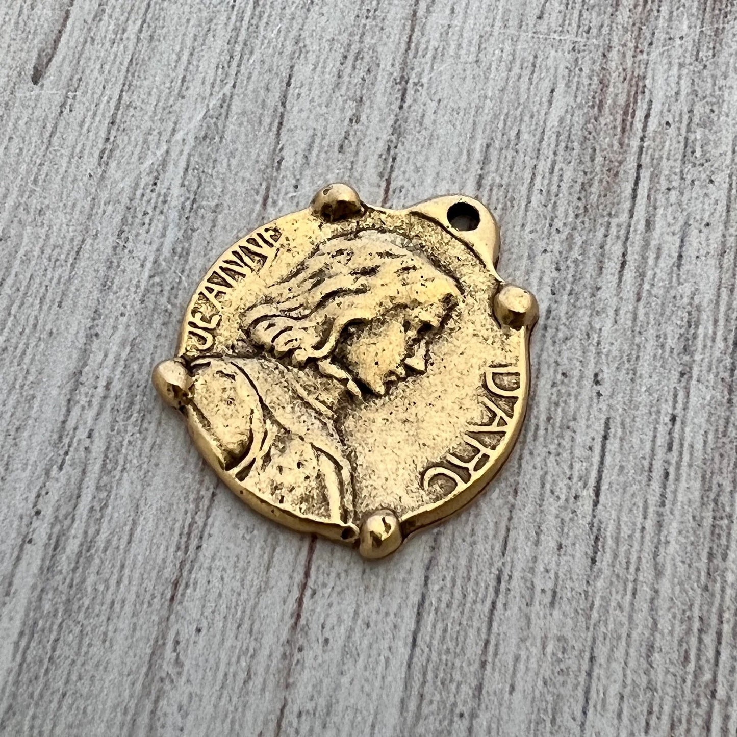 Small Joan of Arc Medal with Frame, Antiqued Gold Charm Pendant, Catholic Jewelry Supplies, GL-6224