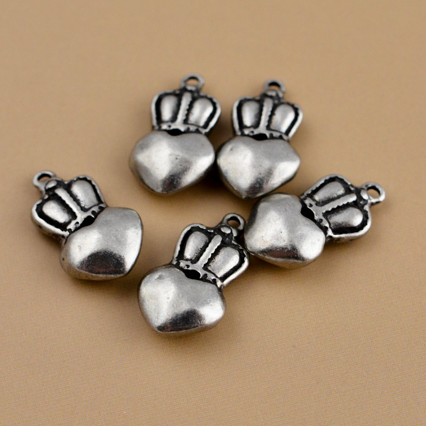 Crowned Heart Pendant, Antiqued Silver Charm, Artisan Jewelry Findings Components, PW-6345