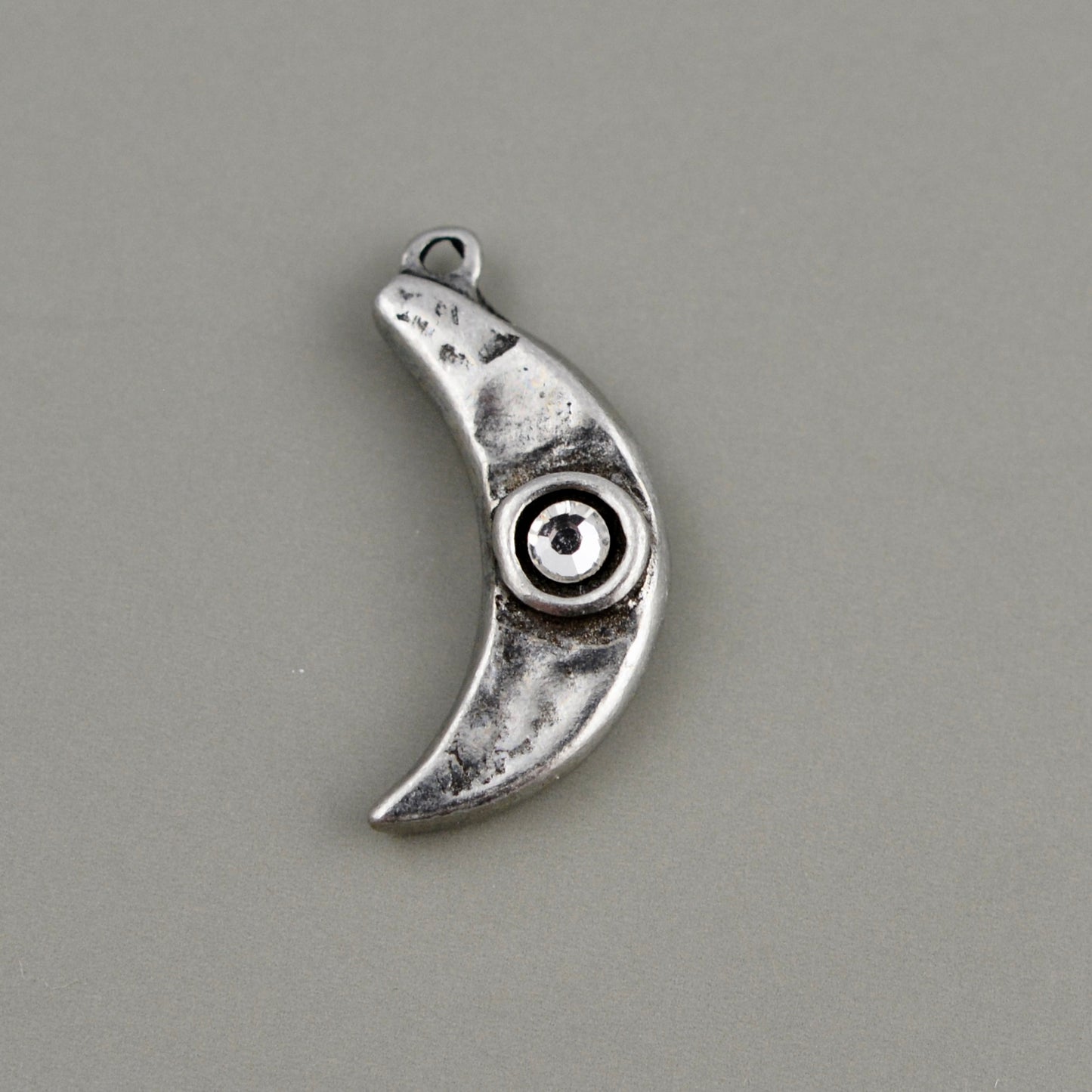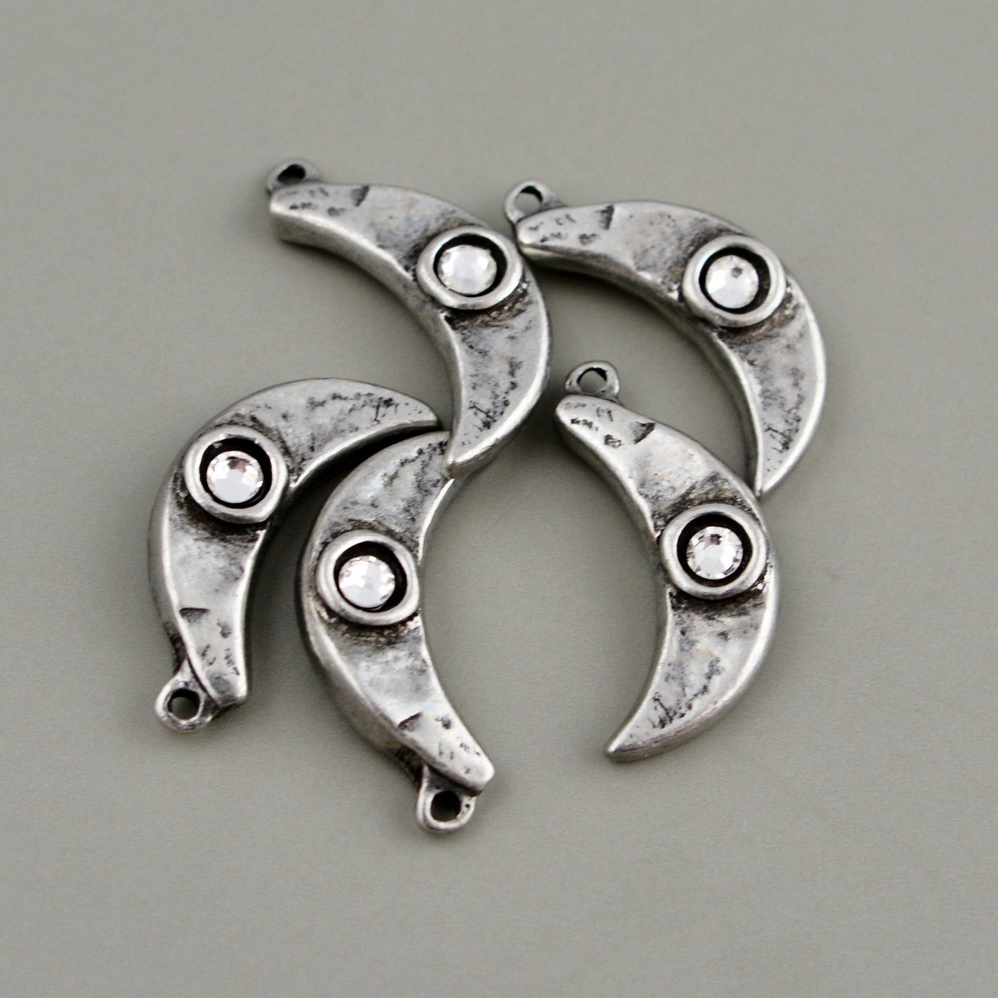 Small Textured Crescent Moon Crystal Rhinestone Pendant, Silver Celestial Charm, Artisan Jewelry Findings, PW-6347