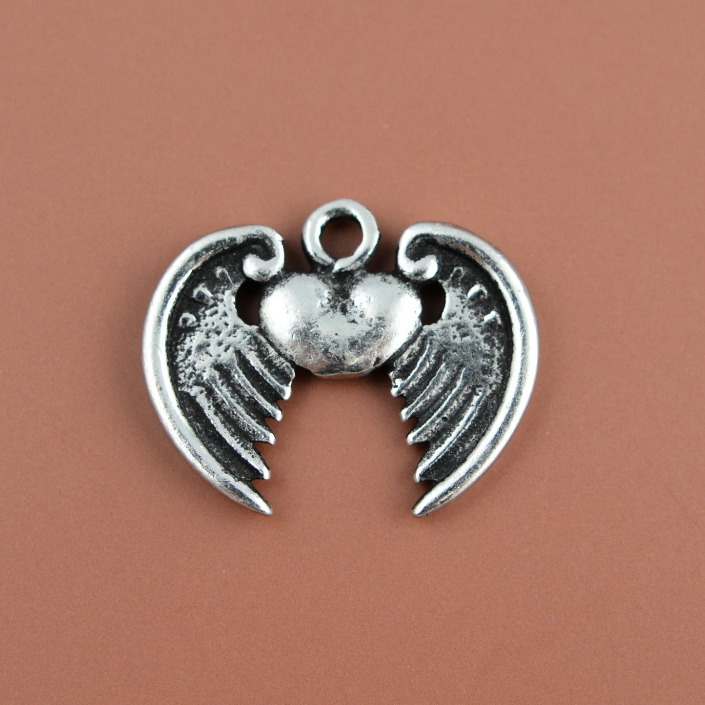 Winged Flying Heart Pendant, Antiqued Silver Pewter Charm, Artisan Jewelry Findings Components, PW-6343
