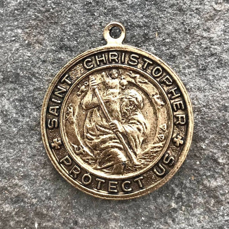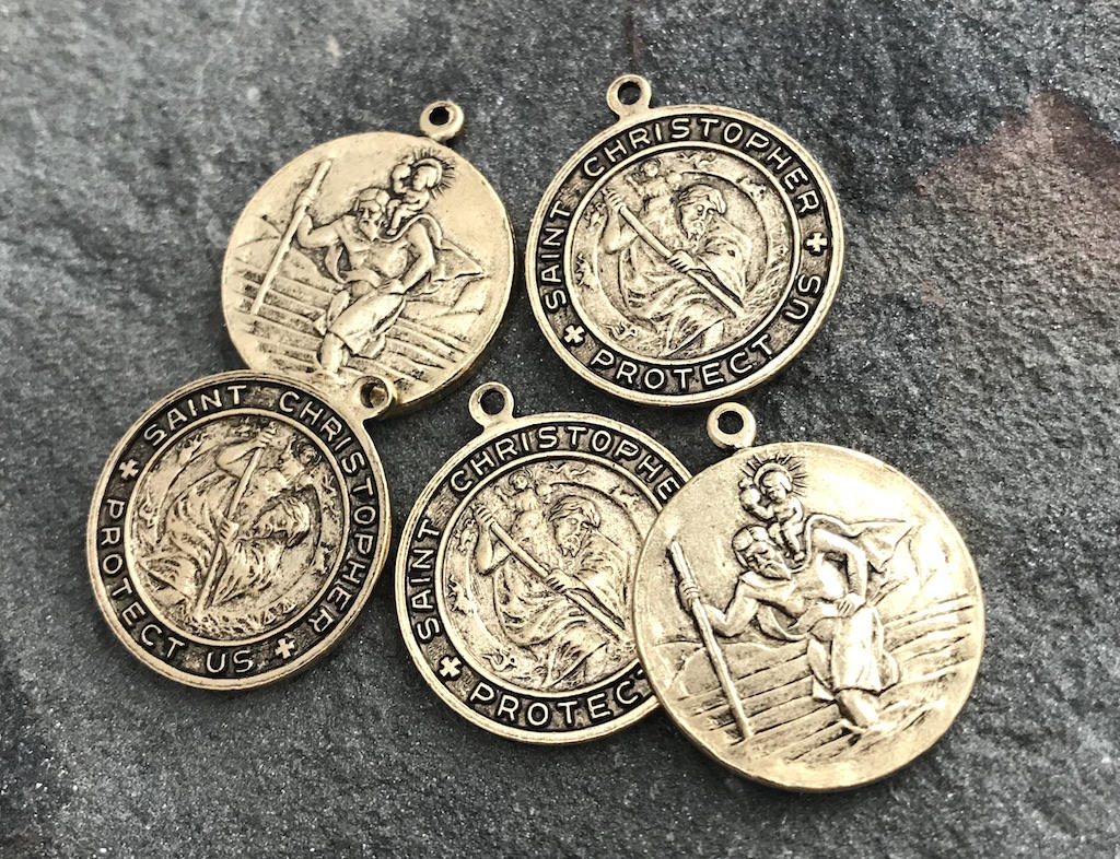 St. Christopher, Catholic Medal, Antique Gold Pendant, Medallion, Religious Charm, Religious Jewelry, Protect Us, Key Chain, GL-6093