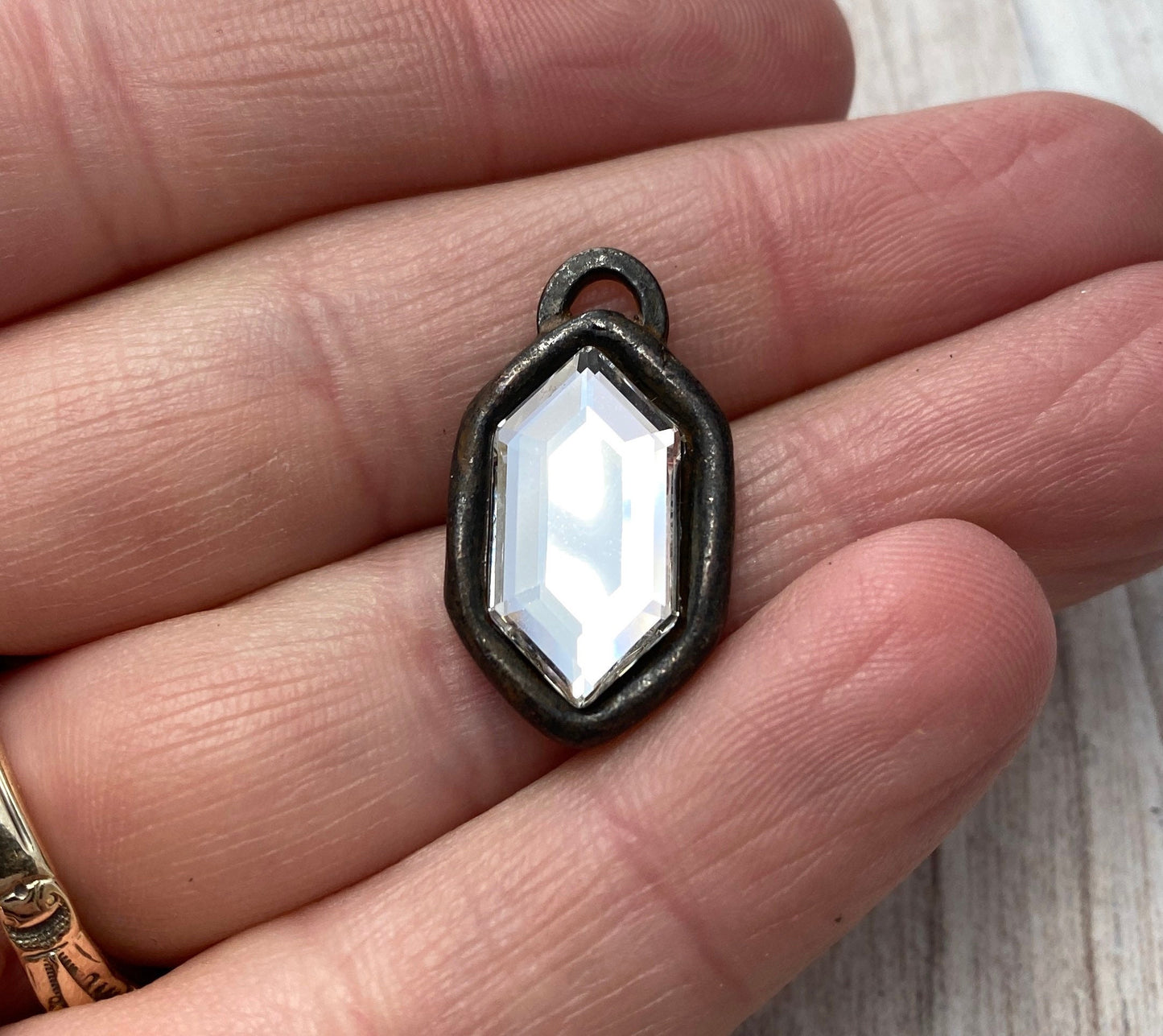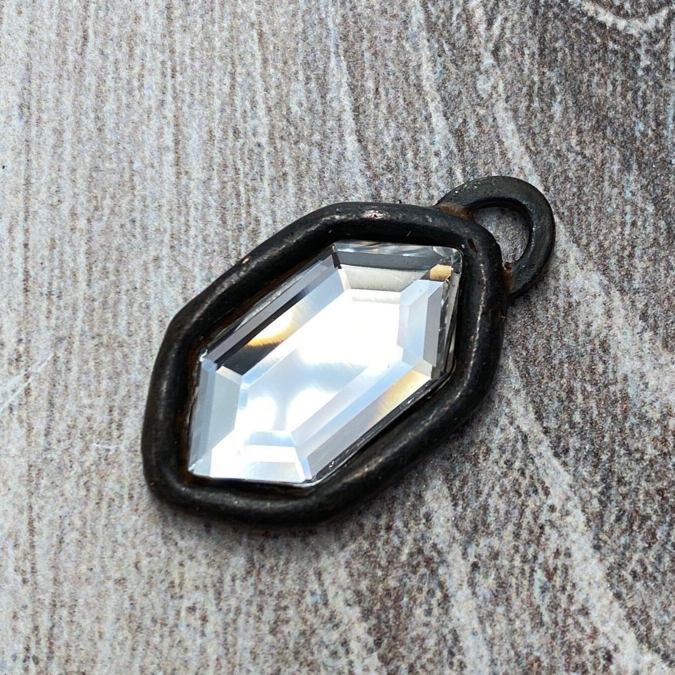 Swarovski Crystal Clear Hexagon Charm, Antiqued Rustic Brown Rhinestone Pendant, Jewelry Making Artisan Findings, BR-S013