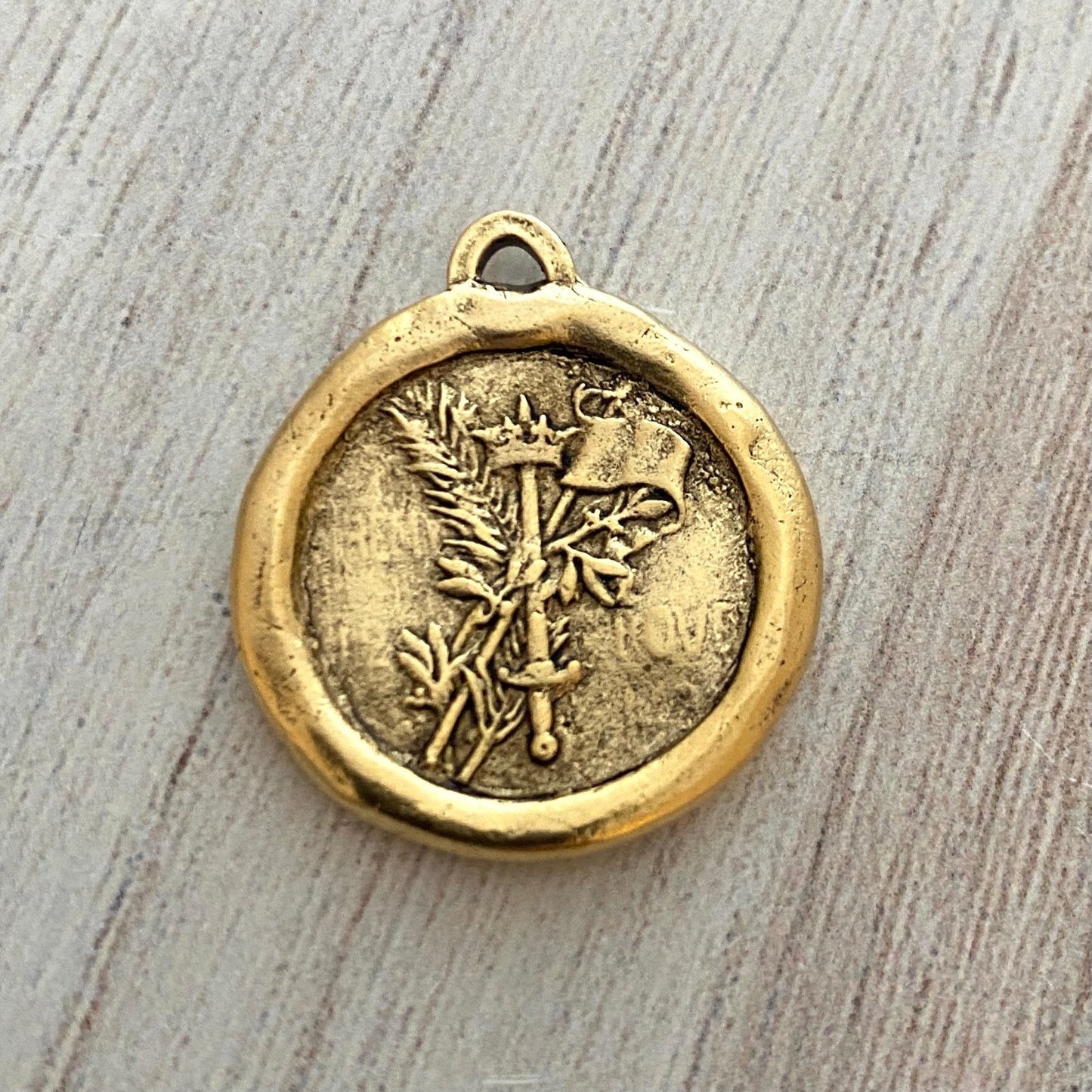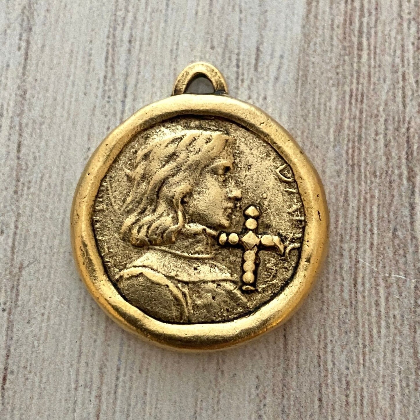 Soldered Joan of Arc Medal, Antiqued Gold Charm Pendant, Brave Woman, Saint of Soldiers, Religious Catholic Jewelry Supplies, GL-6098