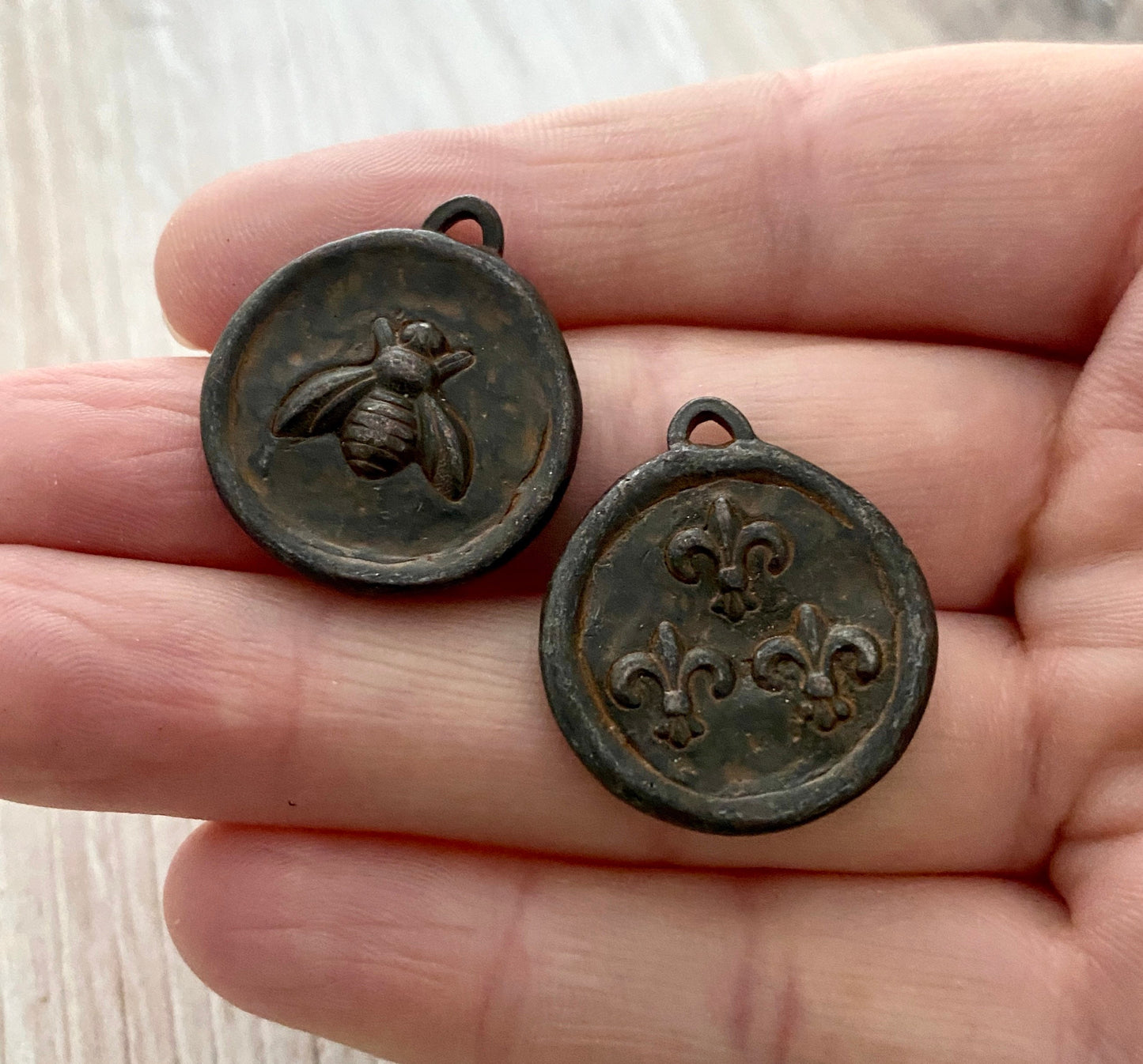 Add Soldered French Bee Charm with Fleur de Lis, Antiqued Rustic Brown Pendant, Jewelry Supplies, BR-6123 to the cart