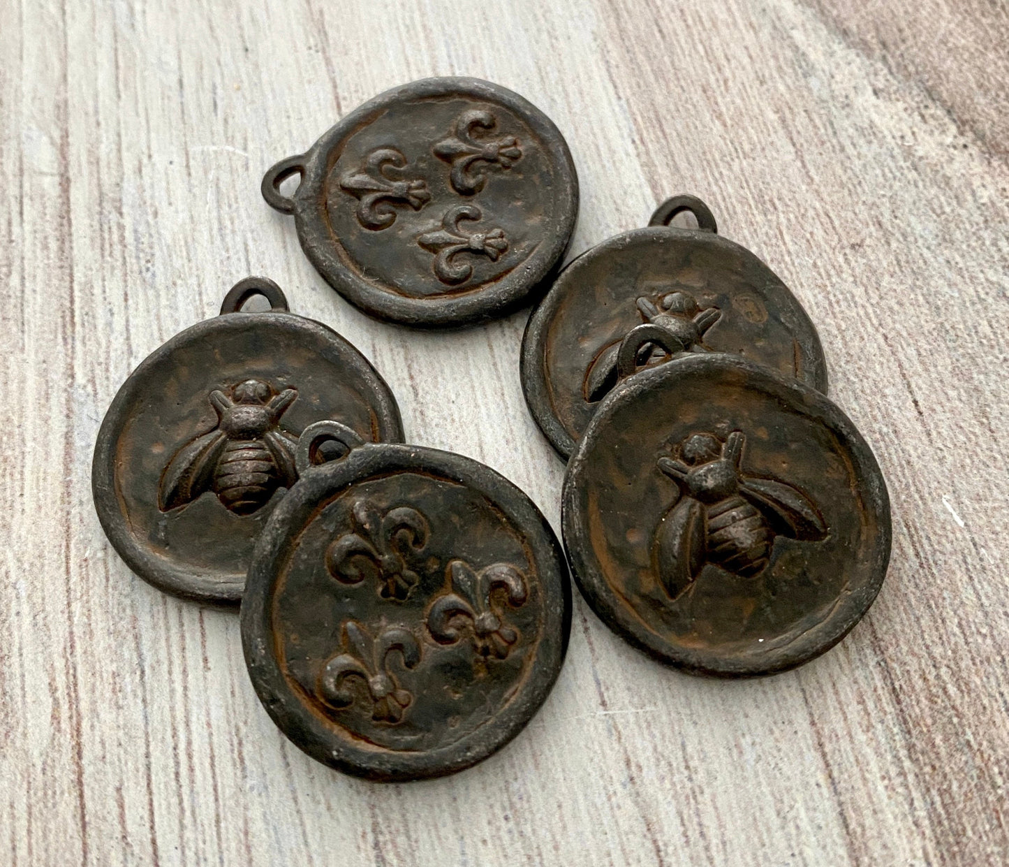 Soldered French Bee Charm with Fleur de Lis, Antiqued Rustic Brown Pendant, Jewelry Supplies, BR-6123