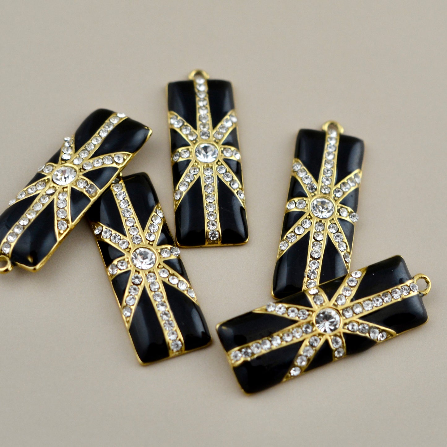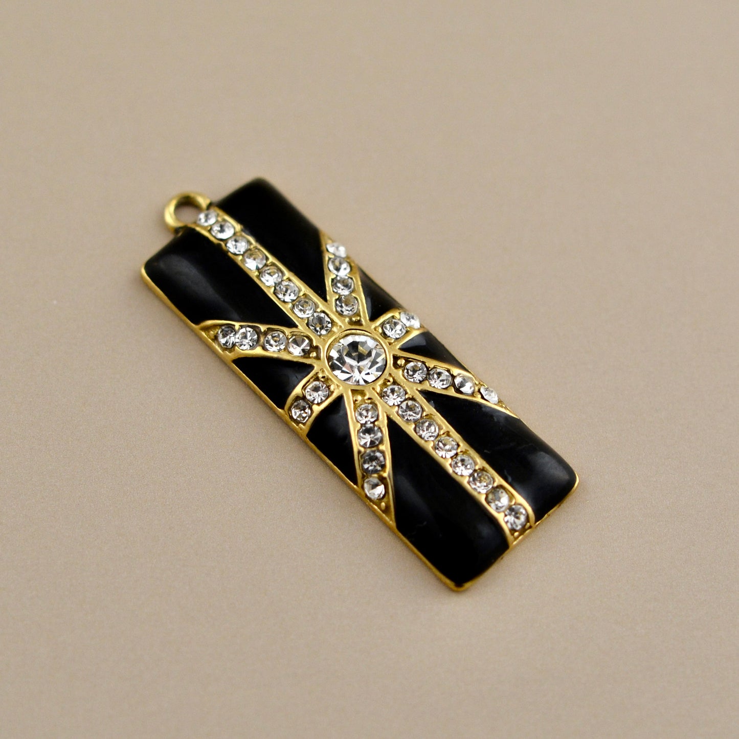 Enamel Rhinestone Crystal Baguette Black and Gold Charm, Rectangle Pendant, Jewelry Making Artisan Findings, GL-6340