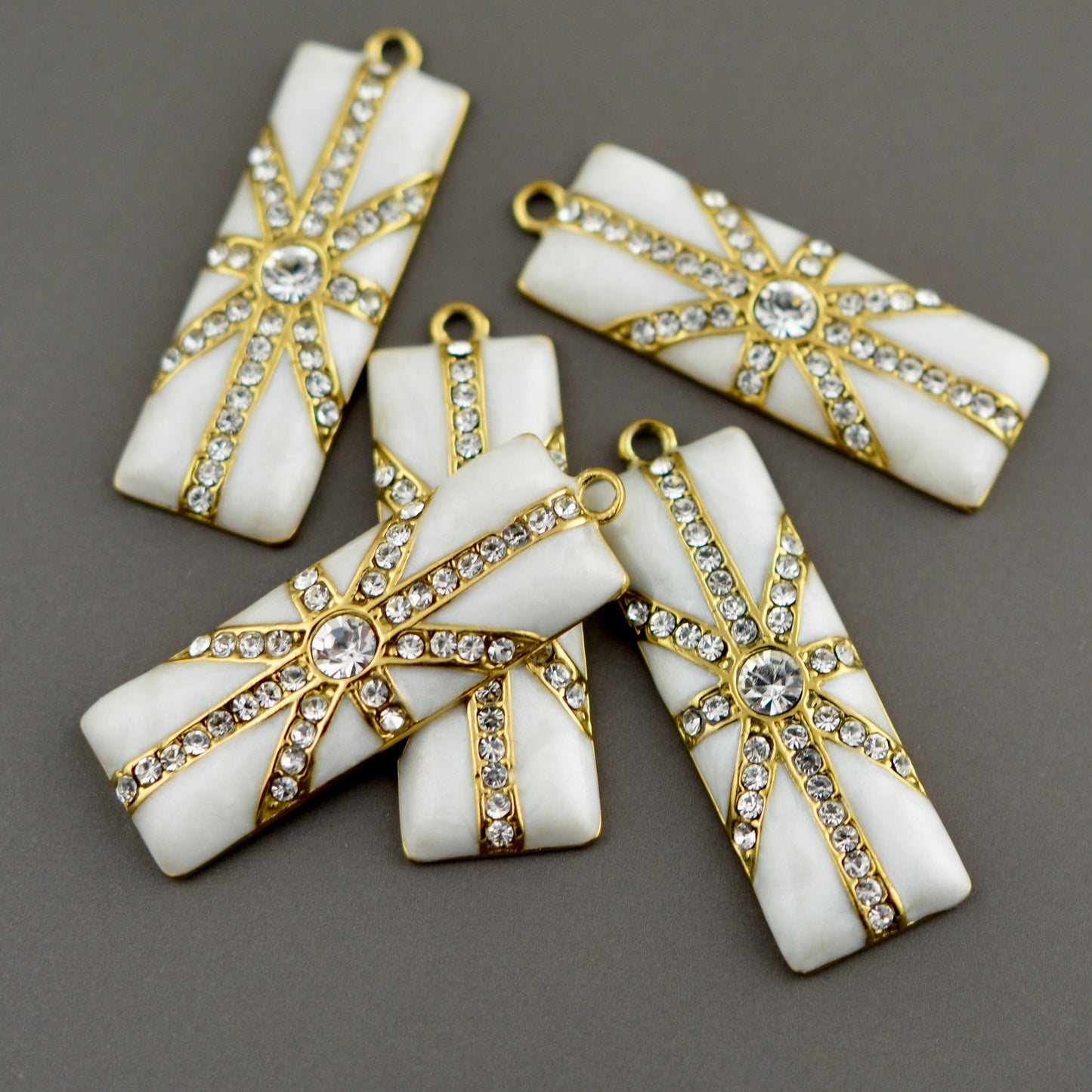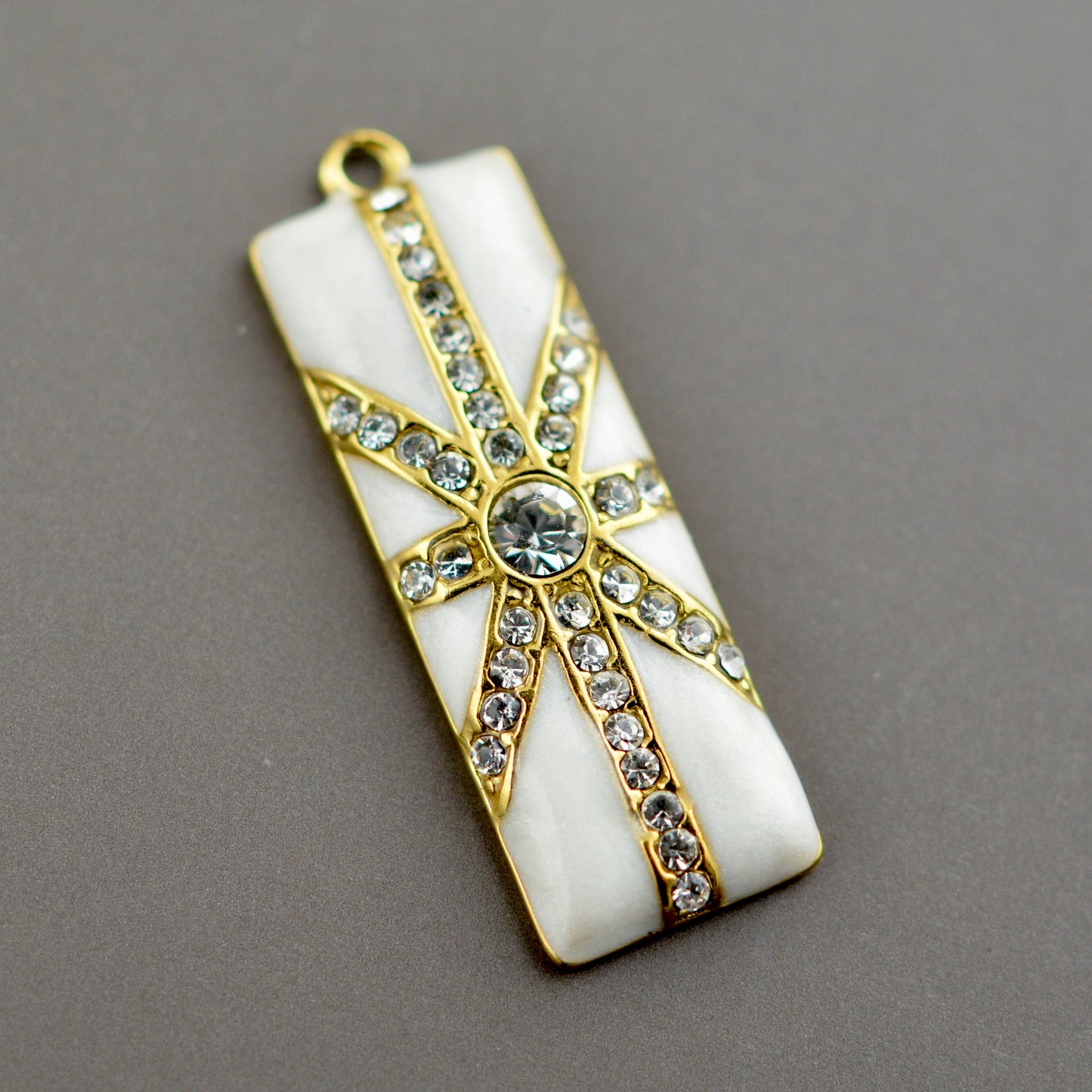 Enamel Rhinestone Crystal Baguette White and Gold Charm, Rectangle Pendant, Jewelry Making Artisan Findings, GL-6341