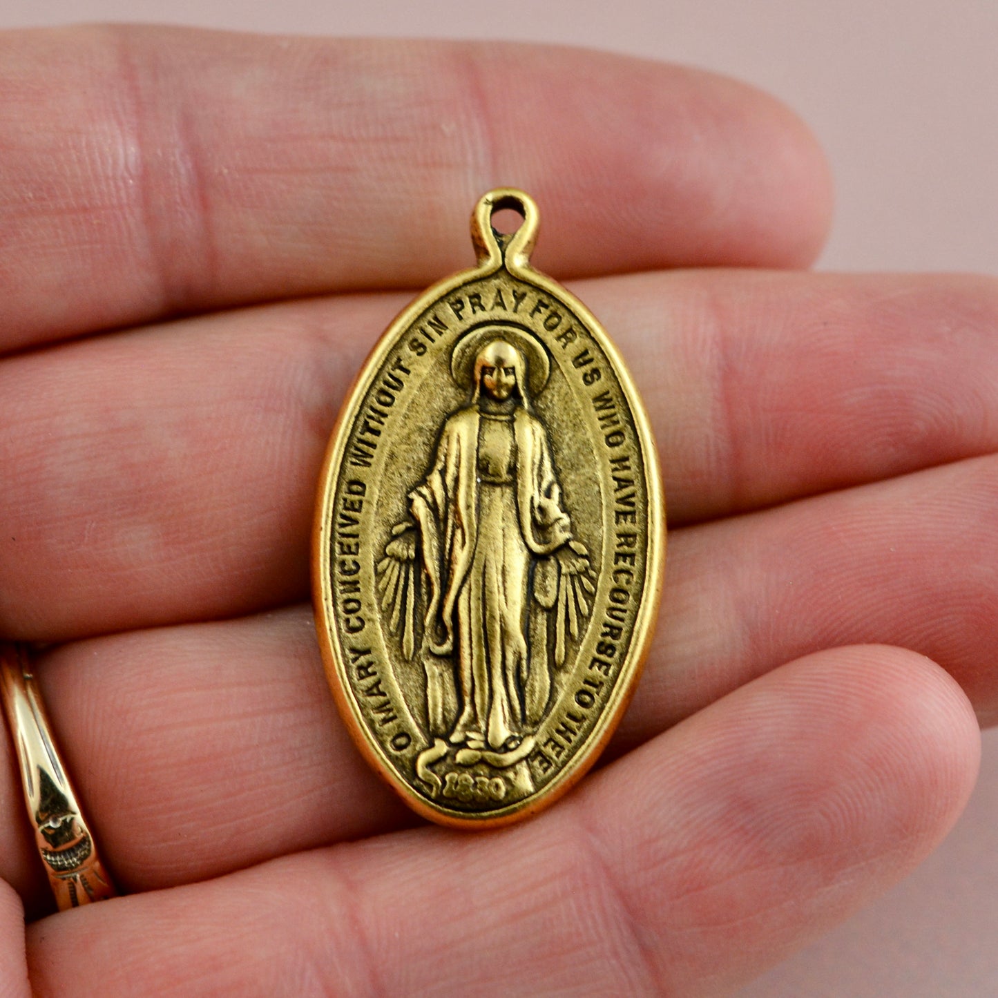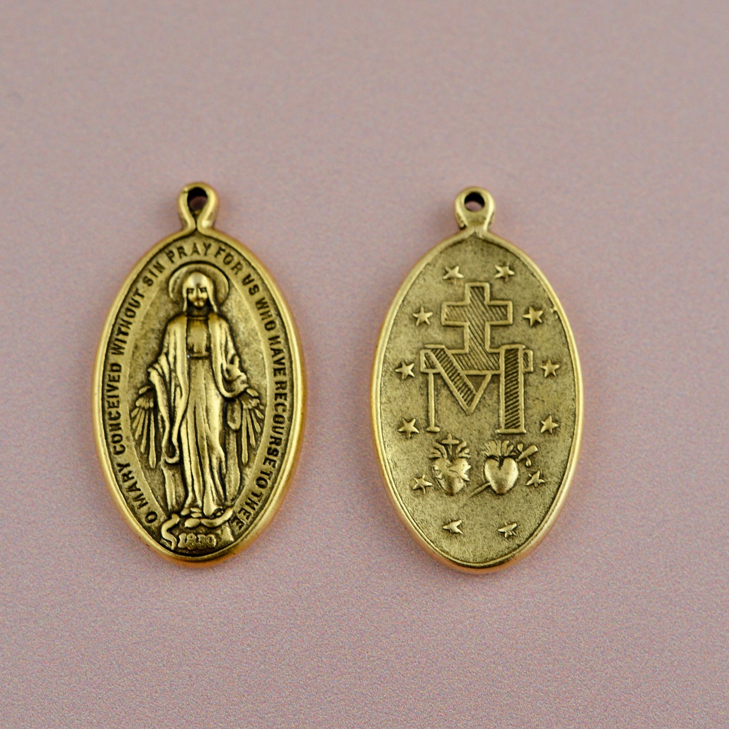 Miraculous Medal, Catholic Religious Mary Pendant, Antiqued Gold Charm, GL-6334