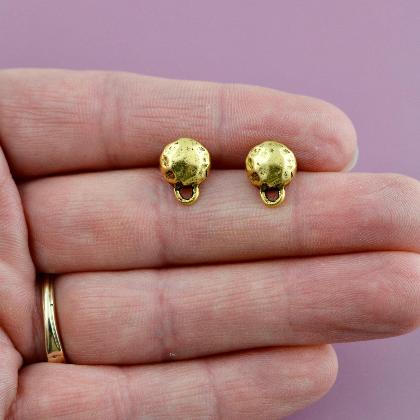 Pair of Small Hammered Puffy Circle Studs, Antiqued Gold Earring Post, Jewelry Making Artisan Findings, GL-6333