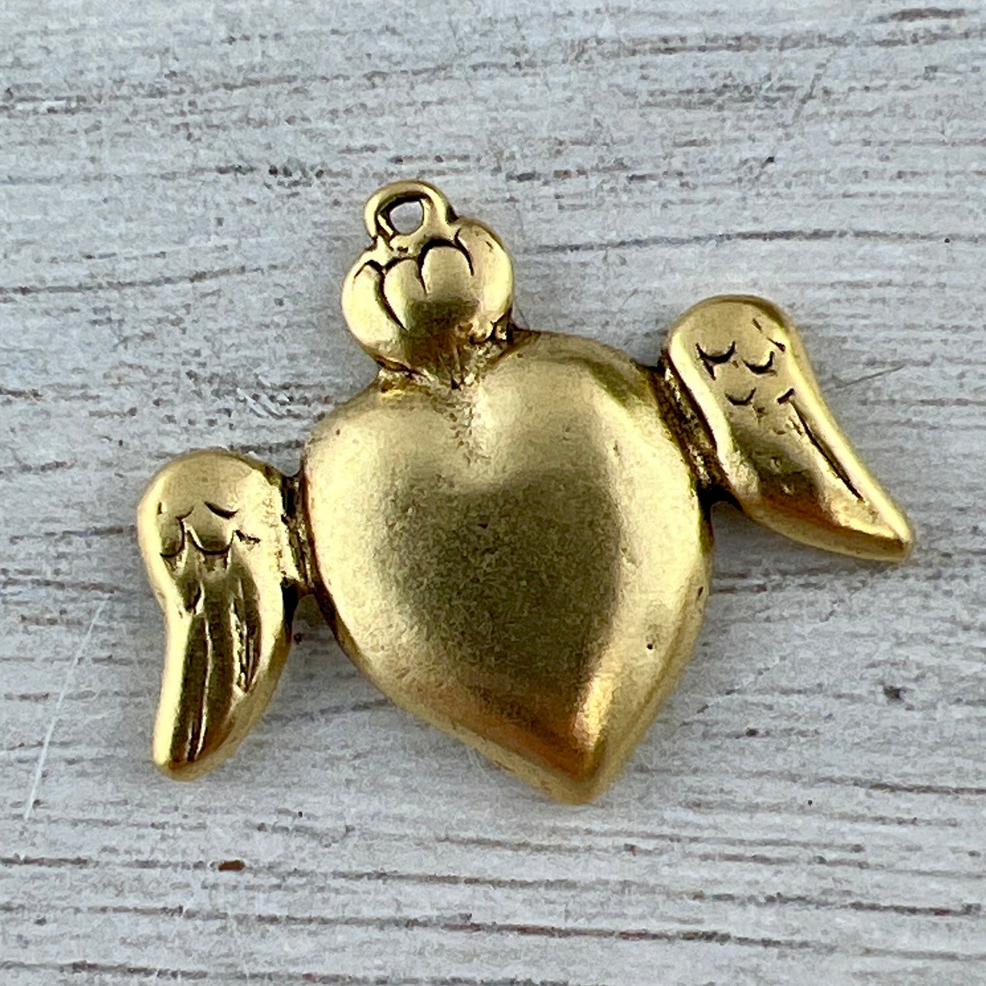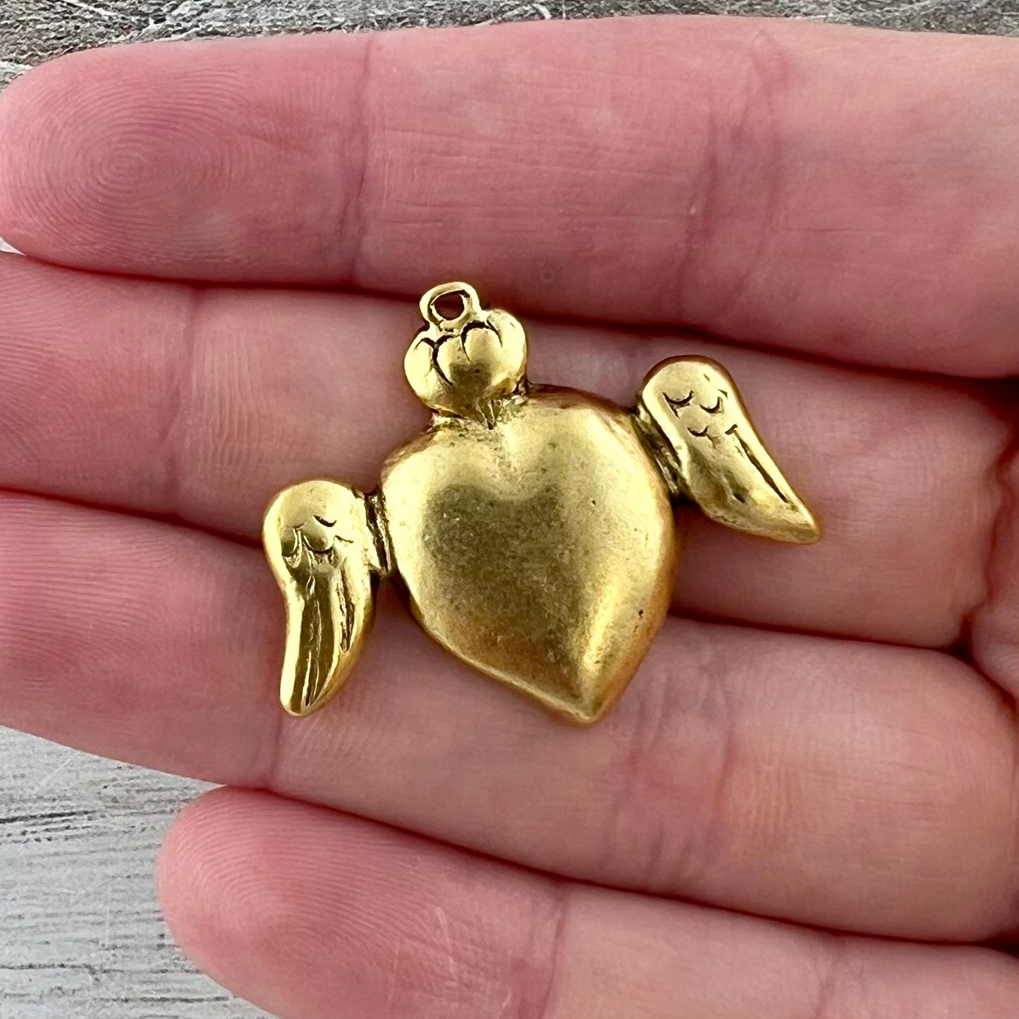 Smooth Winged Heart Pendant, Crowned Antiqued Gold Heart Charm, Artisan Jewelry Findings Components, GL-6310