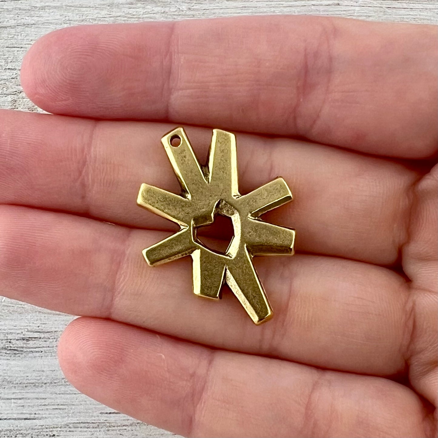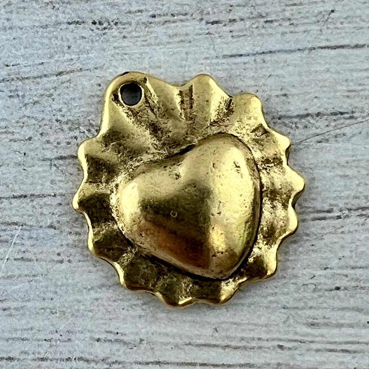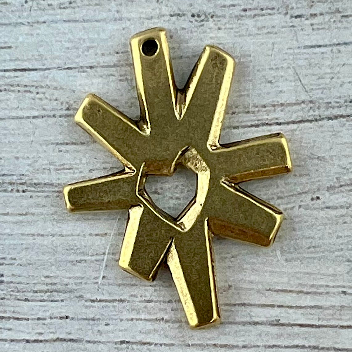 Starburst Radiant Heart Charm, Antiqued Gold Pendant, Artisan Jewelry Supplies, GL-6311