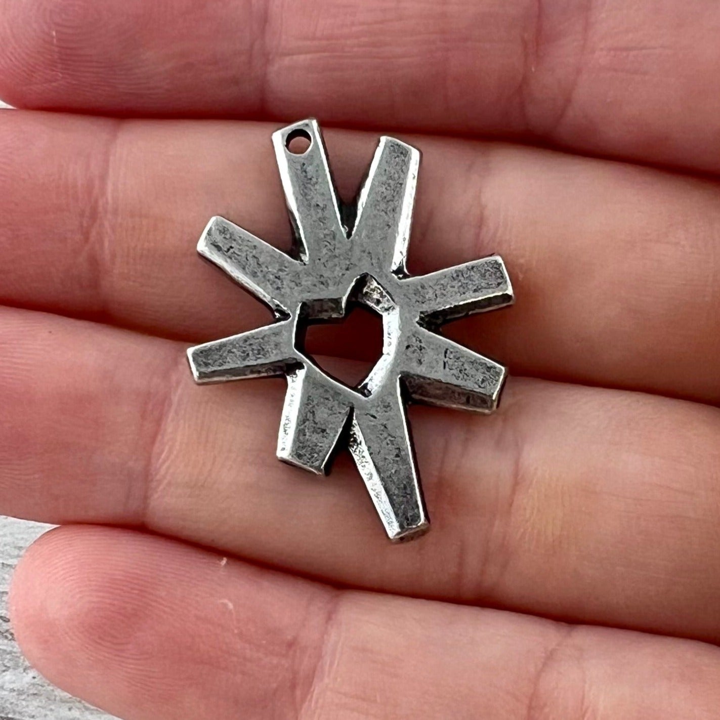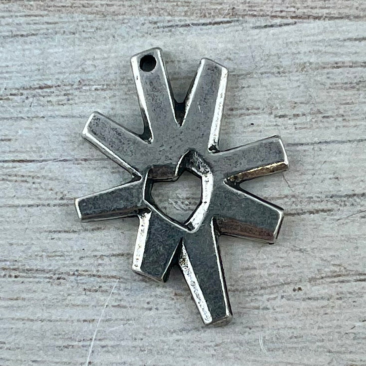 Starburst Radiant Heart Charm, Antiqued Silver Pendant, Artisan Jewelry Supplies, PW-6311