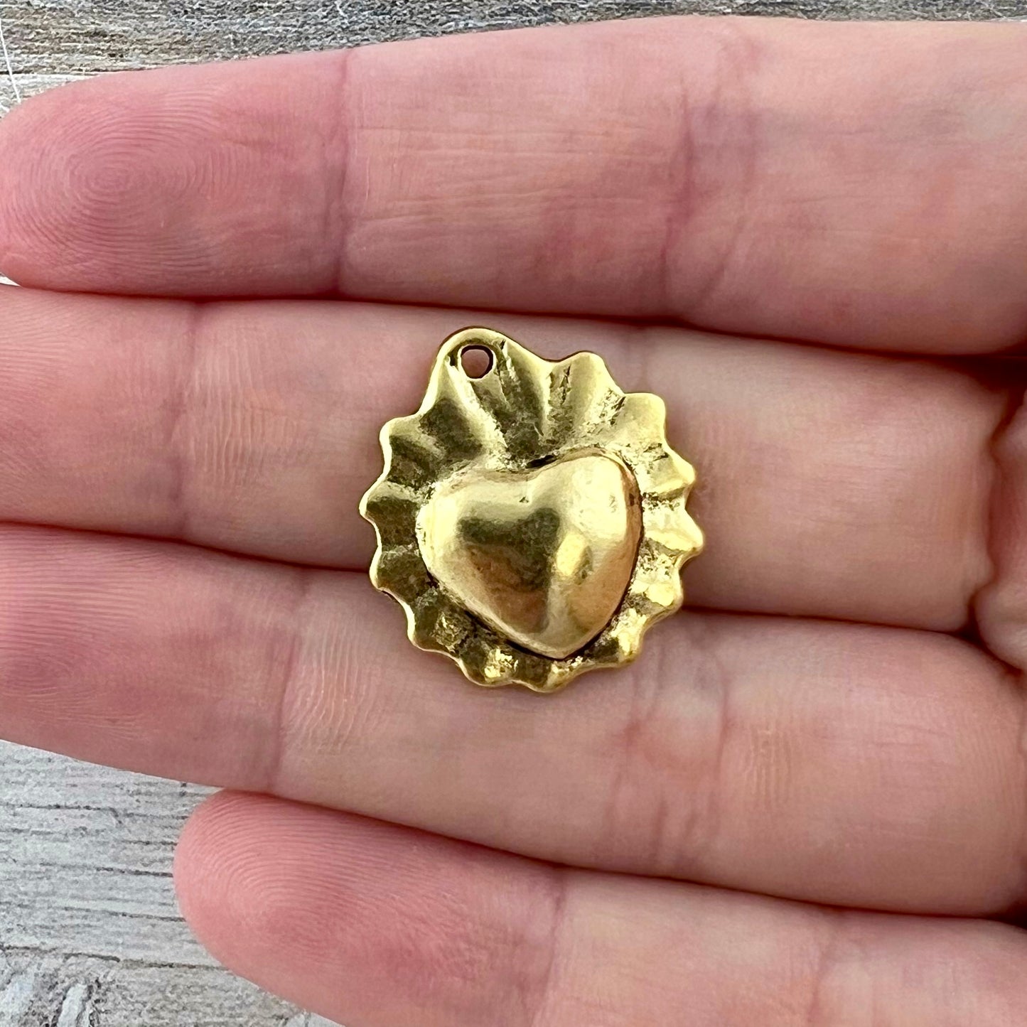 Sacred Heart, Flaming Ruffled Scalloped Heart, Antiqued Gold Charm Pendant, Jewelry Findings, GL-6308