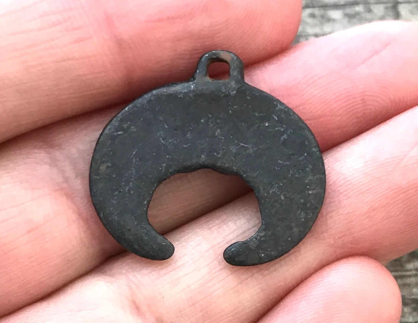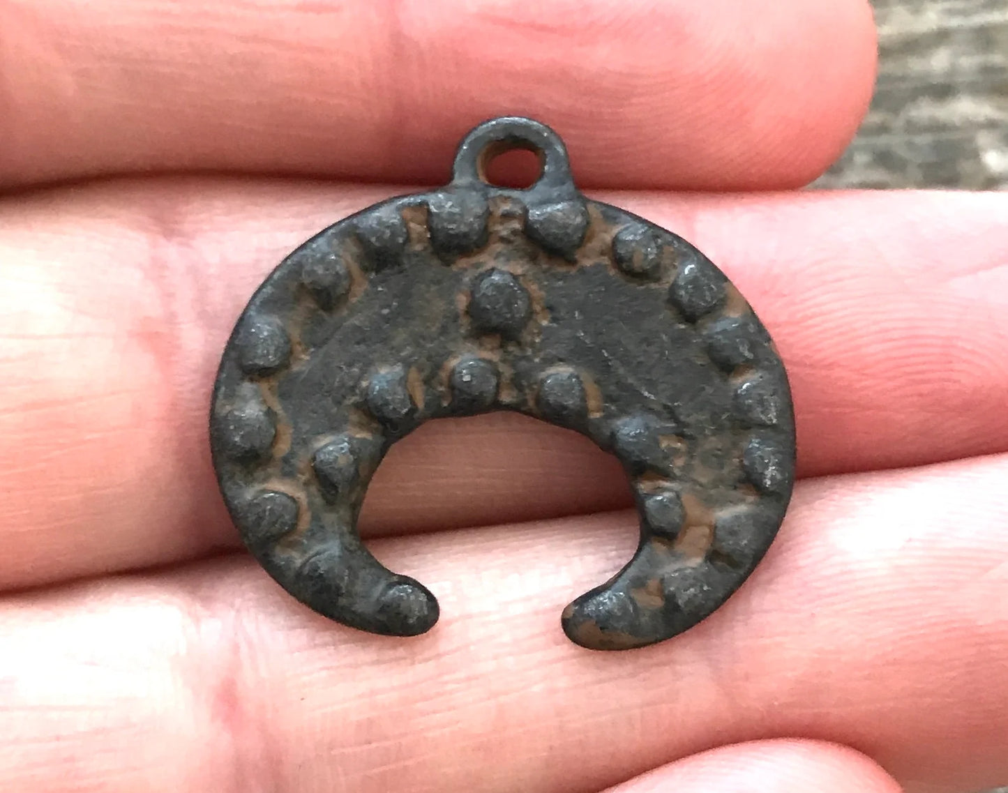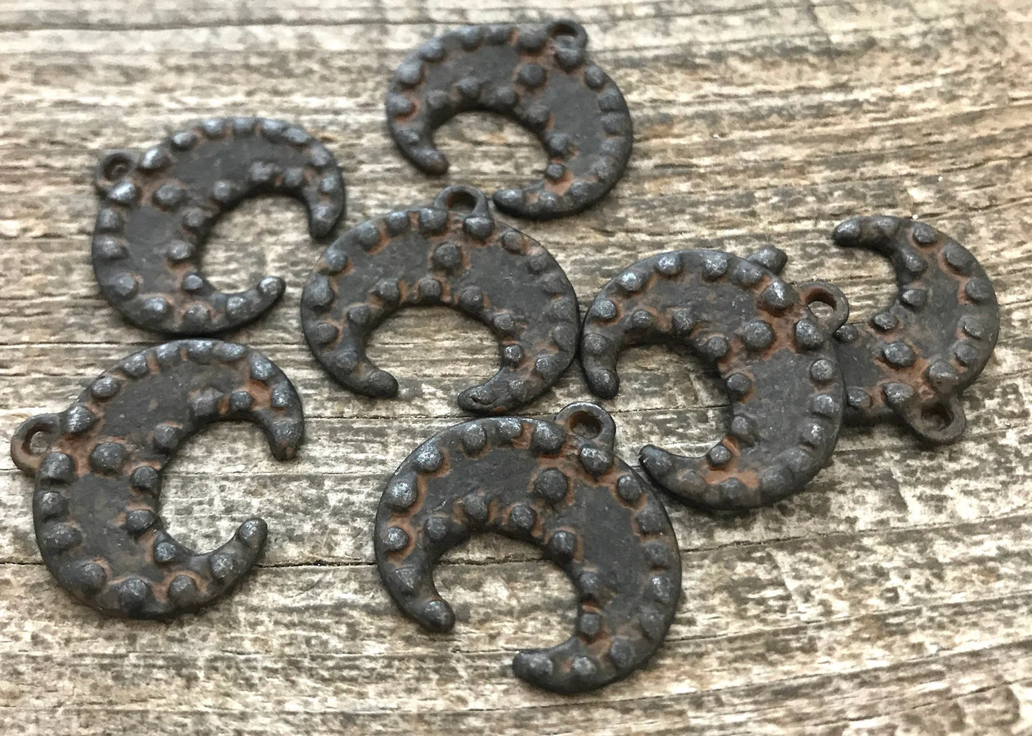 Bumpy Crescent Pendant, Antiqued Rustic Brown Dotted Moon, Artisan Pendant Charm, BR-6067