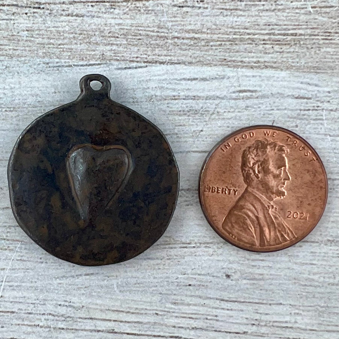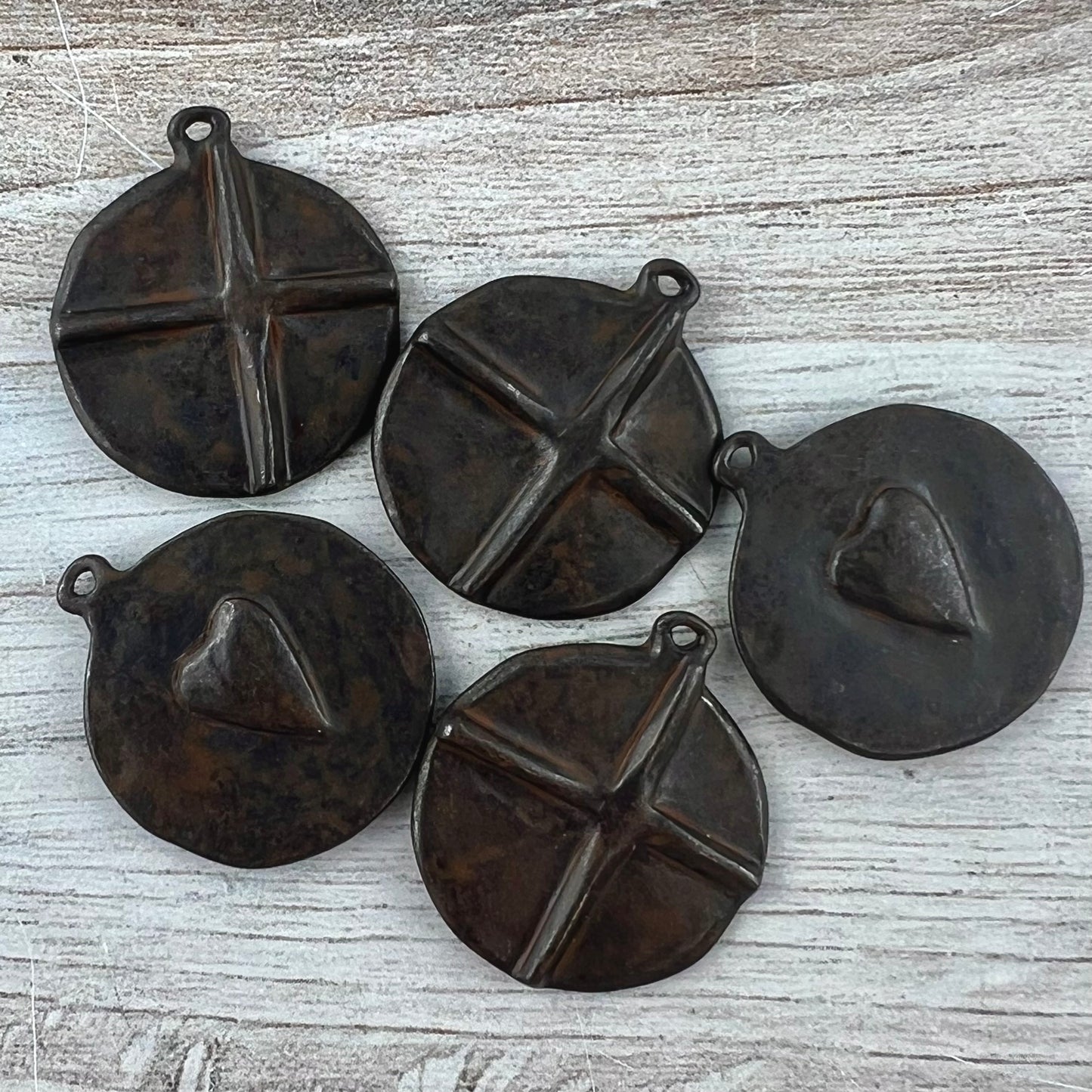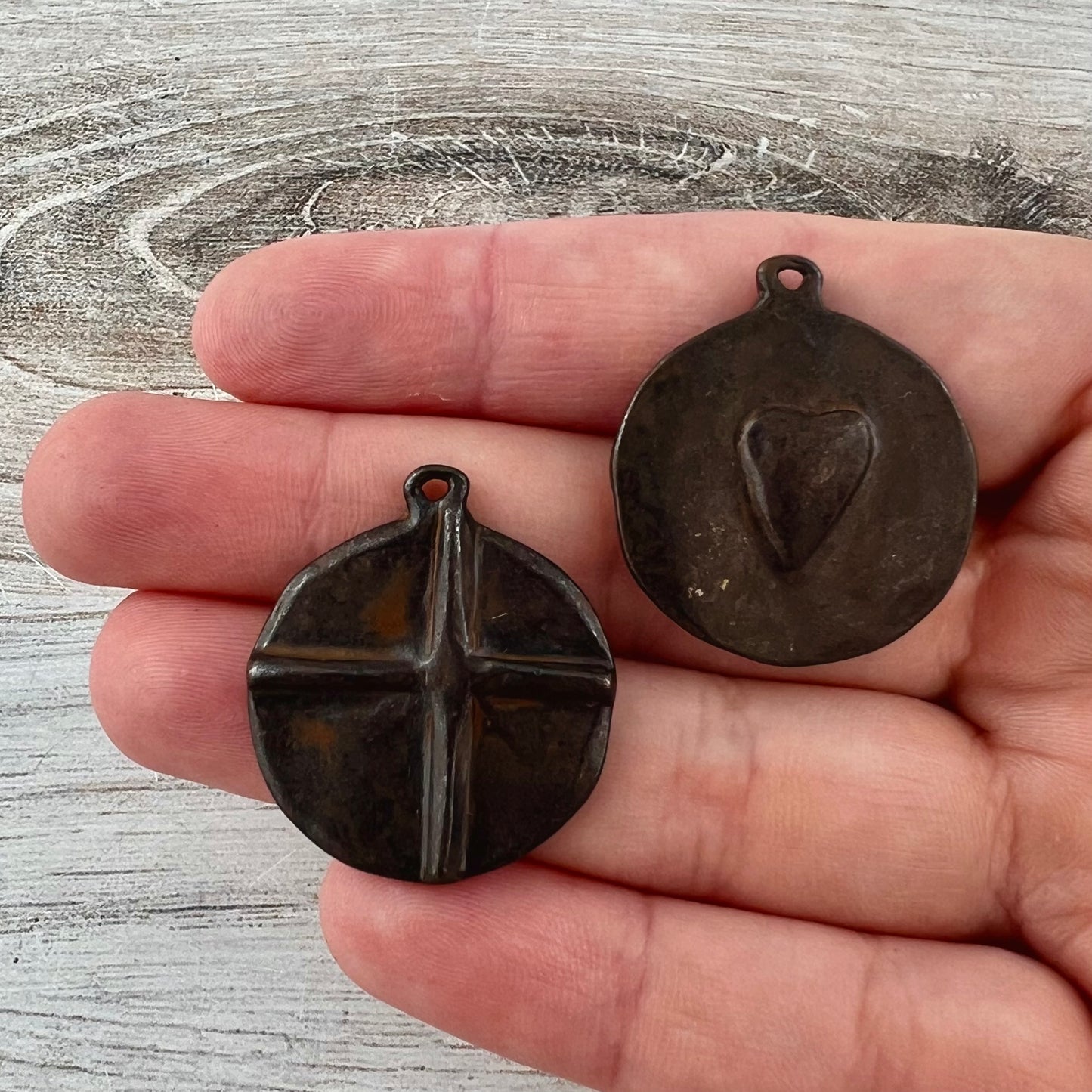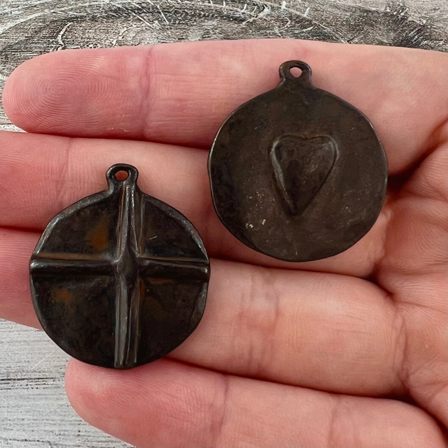 This circle charm features a sleek cross on one side and a sweet heart on the other. It's versatile for necklaces, bracelets, or earrings.