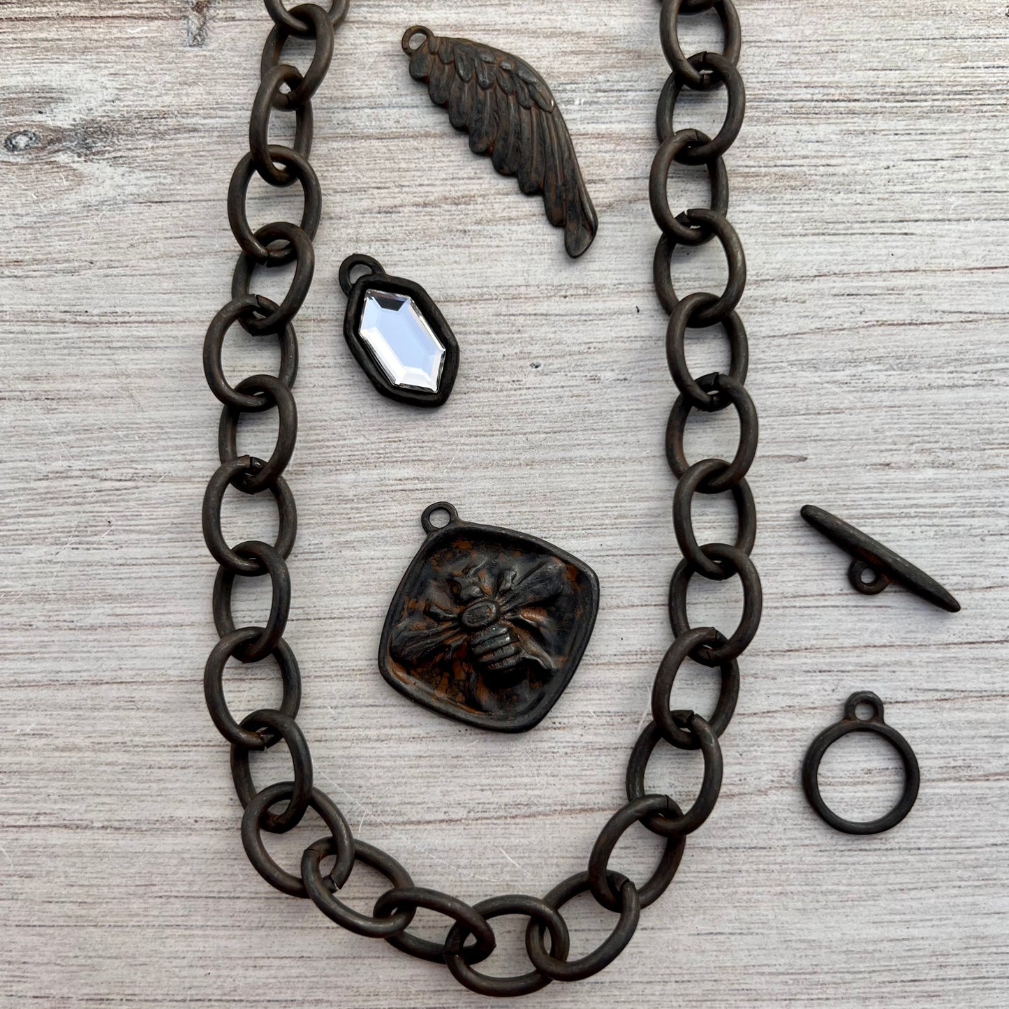 CC pewter components are made of high-quality pewter that is free of lead and cadmium. Most CC chain is made of regular steel, and some is made of brass. It is then plated with the various CC finishes. CC plating is known to hold up very well over time, but as always with any plated items, we recommend keeping it away from water and perfume.