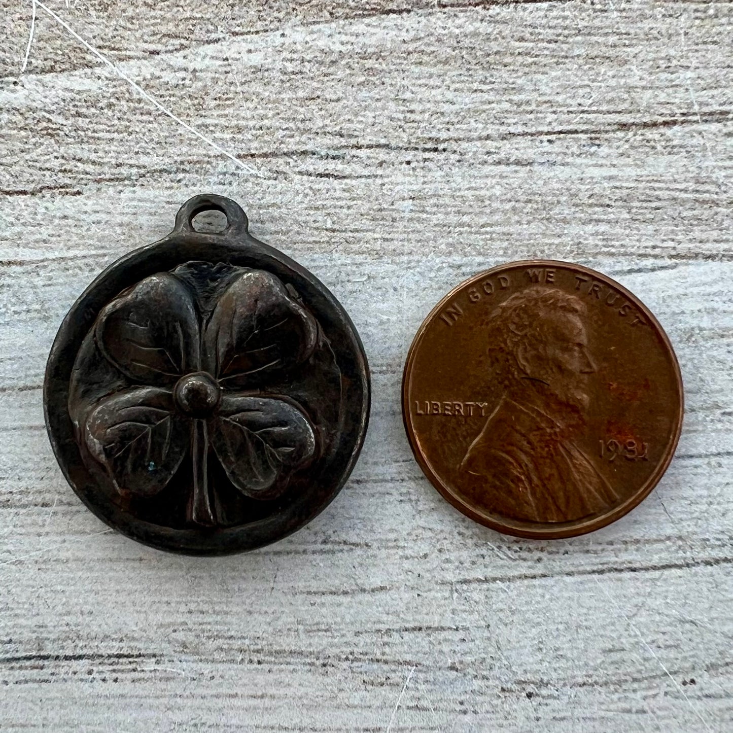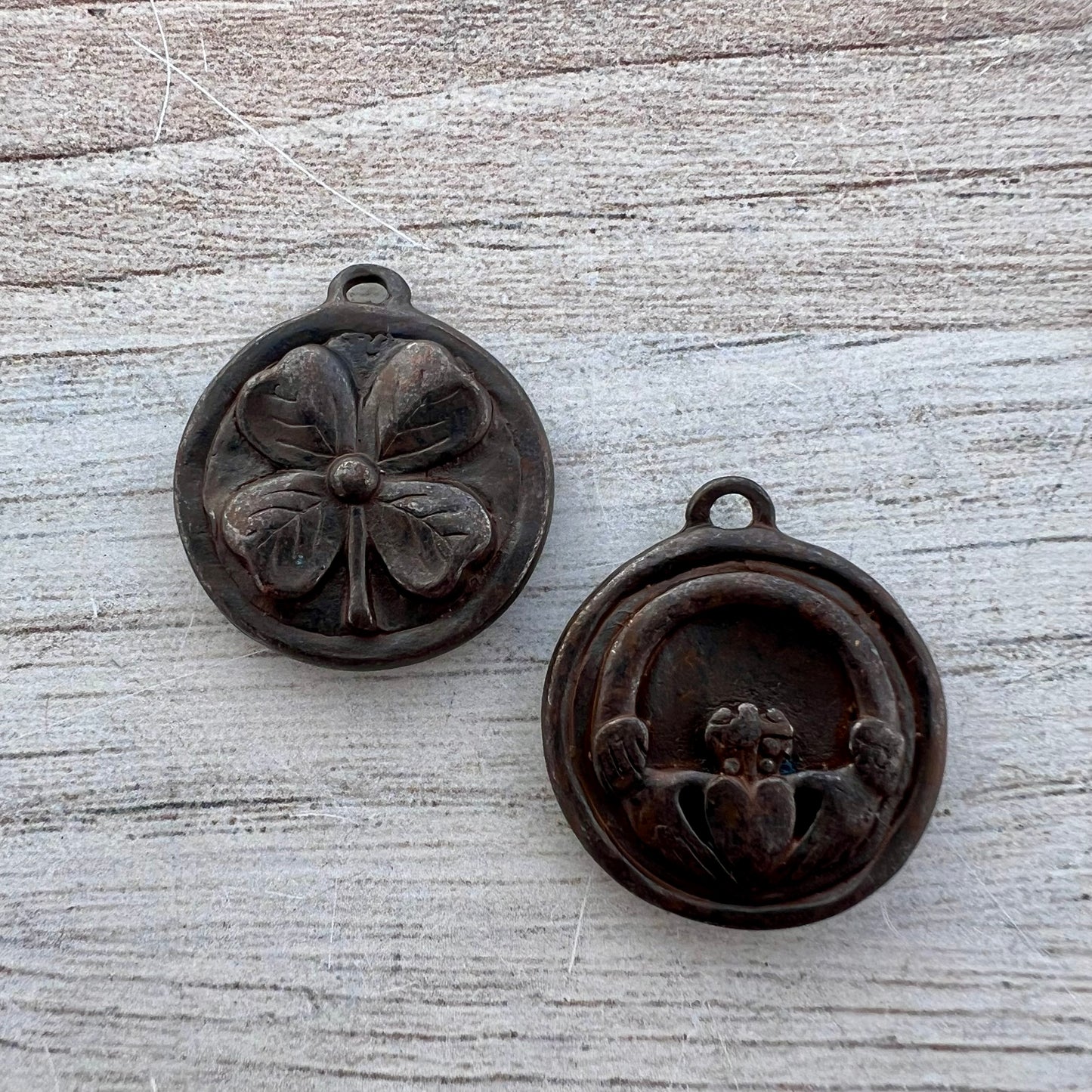 Embrace the luck of the Irish with our Shamrock pendant. Adorned with a traditional Claddagh design on one side and a four leaf clover on the other, this charming soldered-style charm is perfect for St. Patrick's Day or any jewelry design.