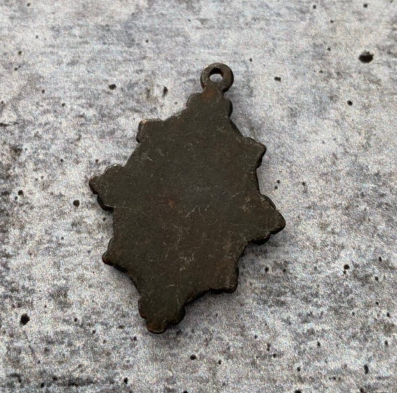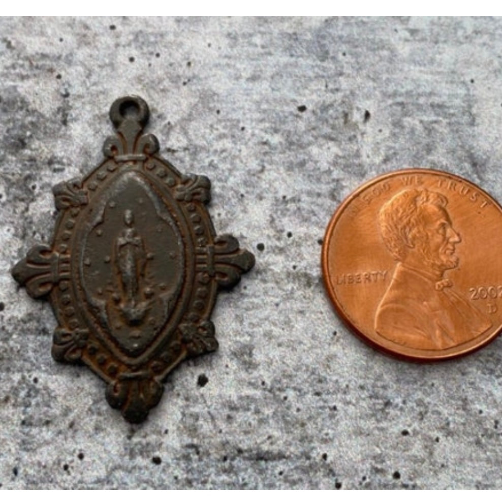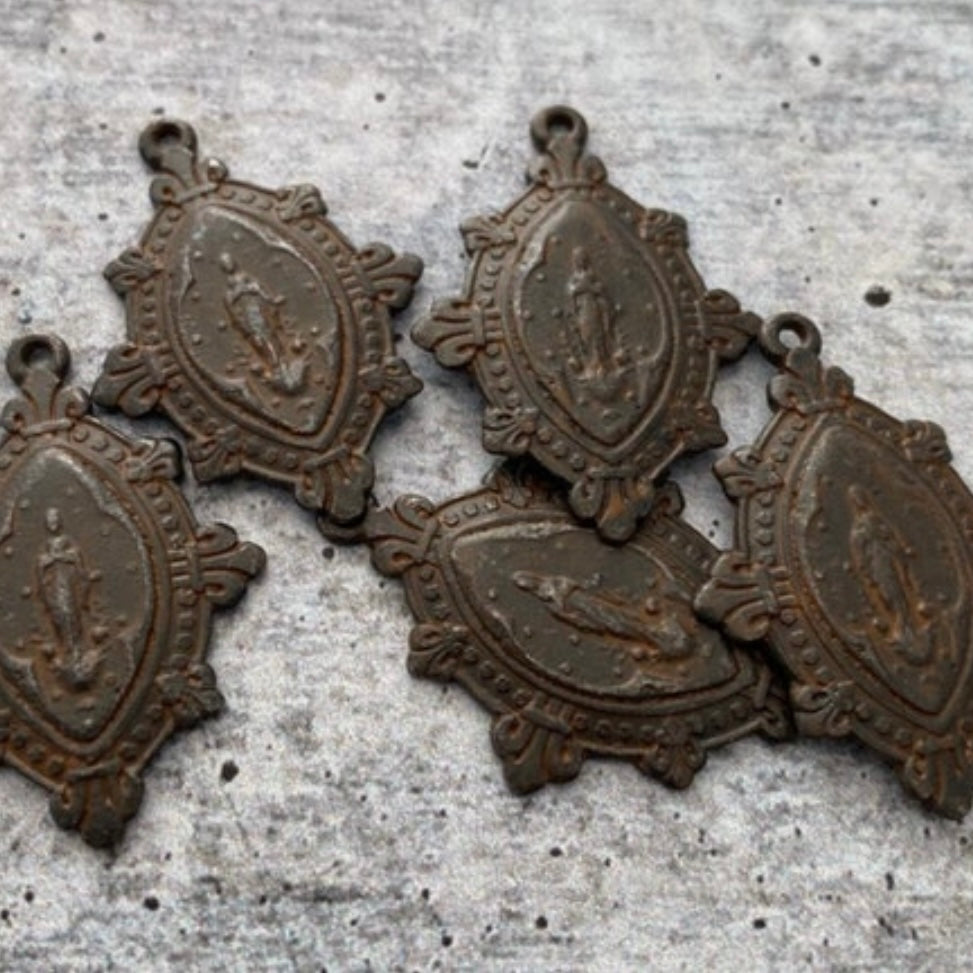 French Mary Medal, Fleur de Lis Pendant, Antiqued Rustic Brown Charm, Catholic Religious Christian Jewelry, BR-6081
