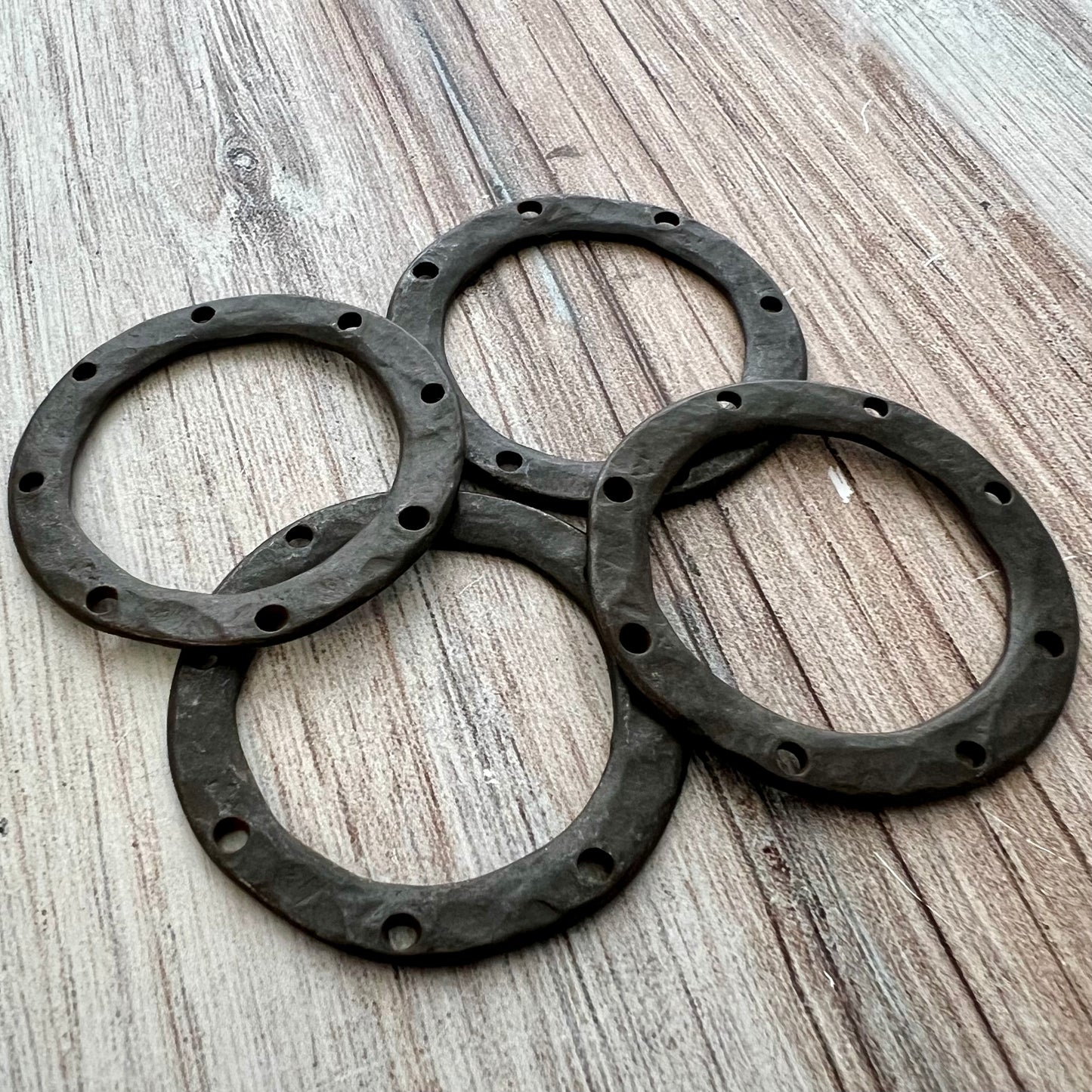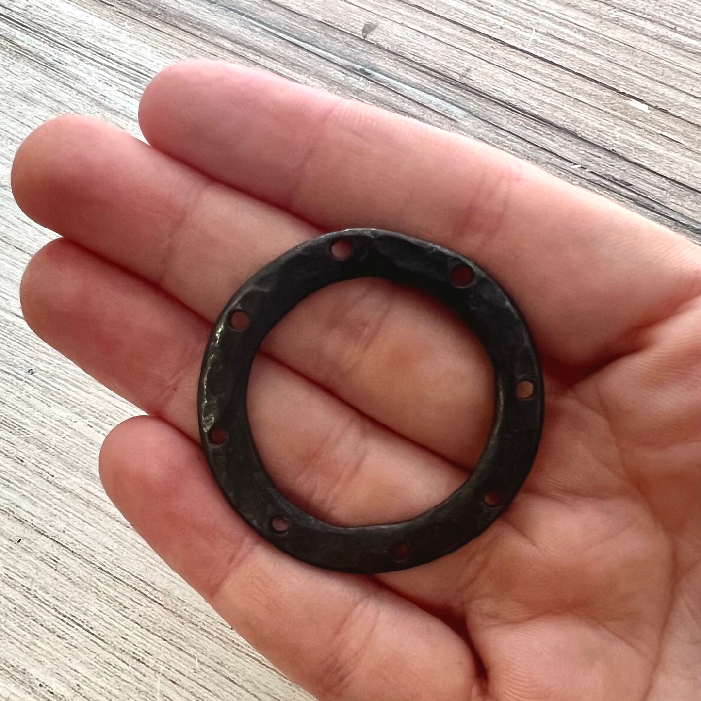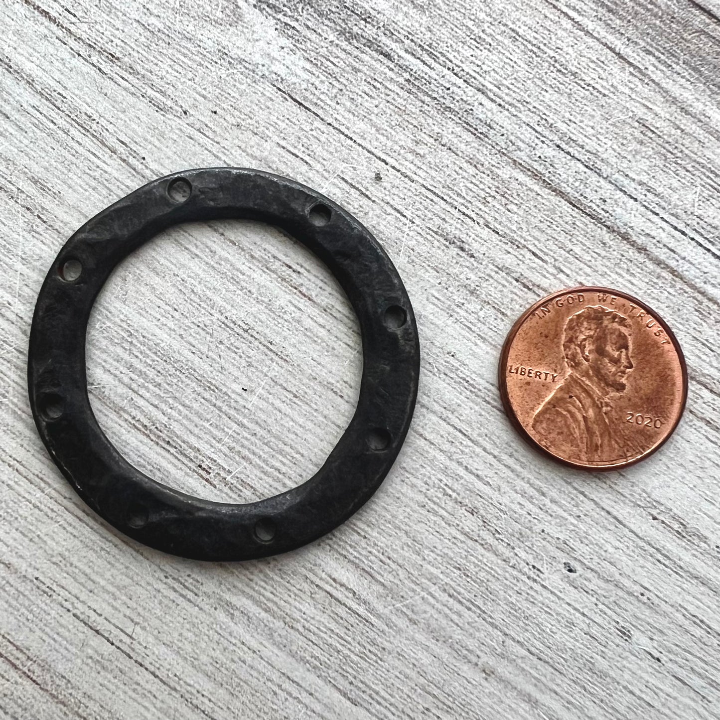 This large hammered ring provides a great focal point for any piece you design, while also serving the function of a multipurpose connector. Use it for earrings, bracelets, or necklaces. The many holes allow you to get creative with attachments! Use jump rings, leather, or wire to attach charms, chain, or gemstones and beads.