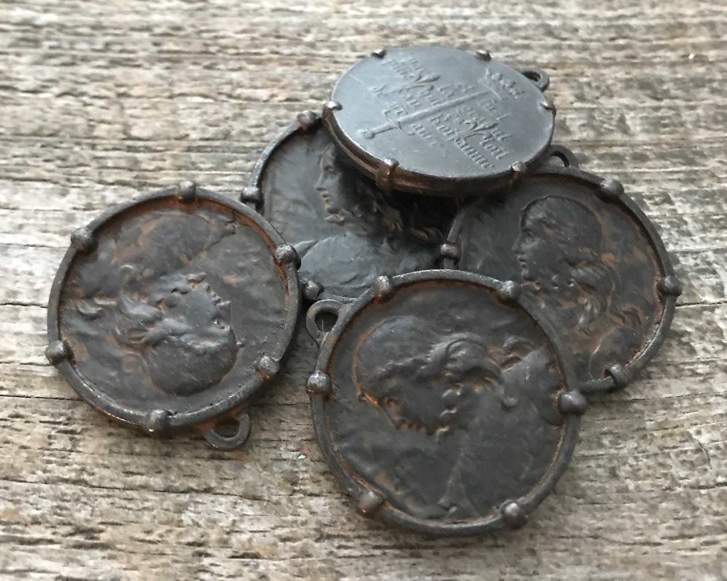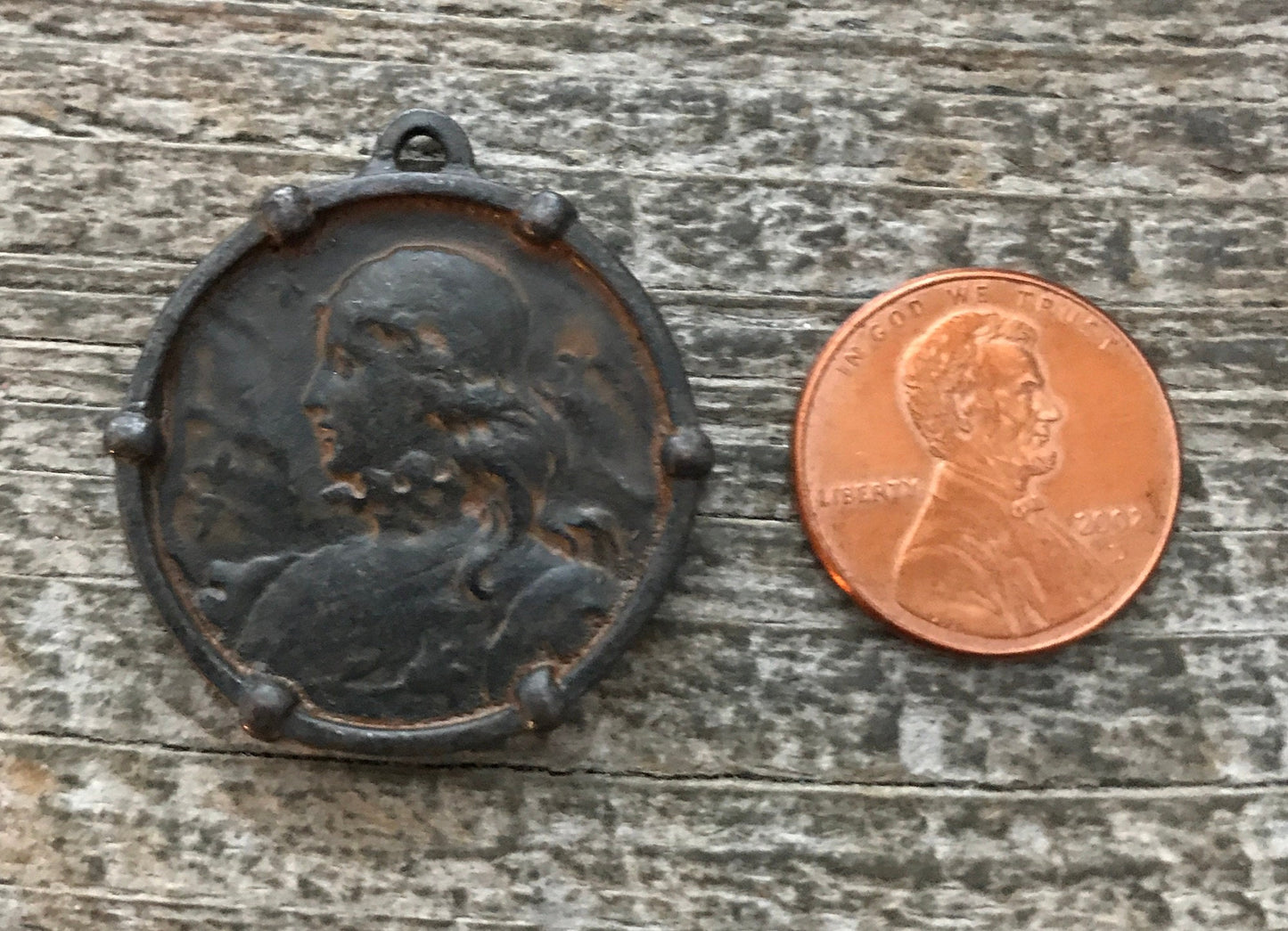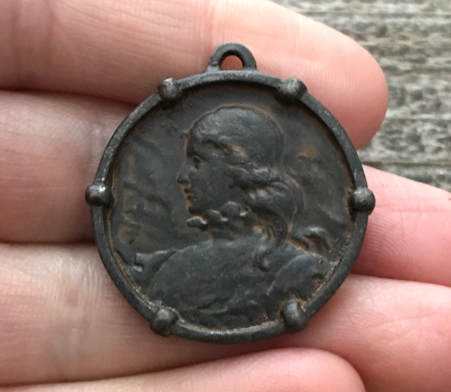 This unique and lovely medal depicts Joan of Arc, known for her intense bravery and devotion to hearing and following her convictions. She is known as the patron saint of soldiers. I bought the original of this medal from France. It dates circa early 1900’s. This medal is thick and has a very nice weight to it.