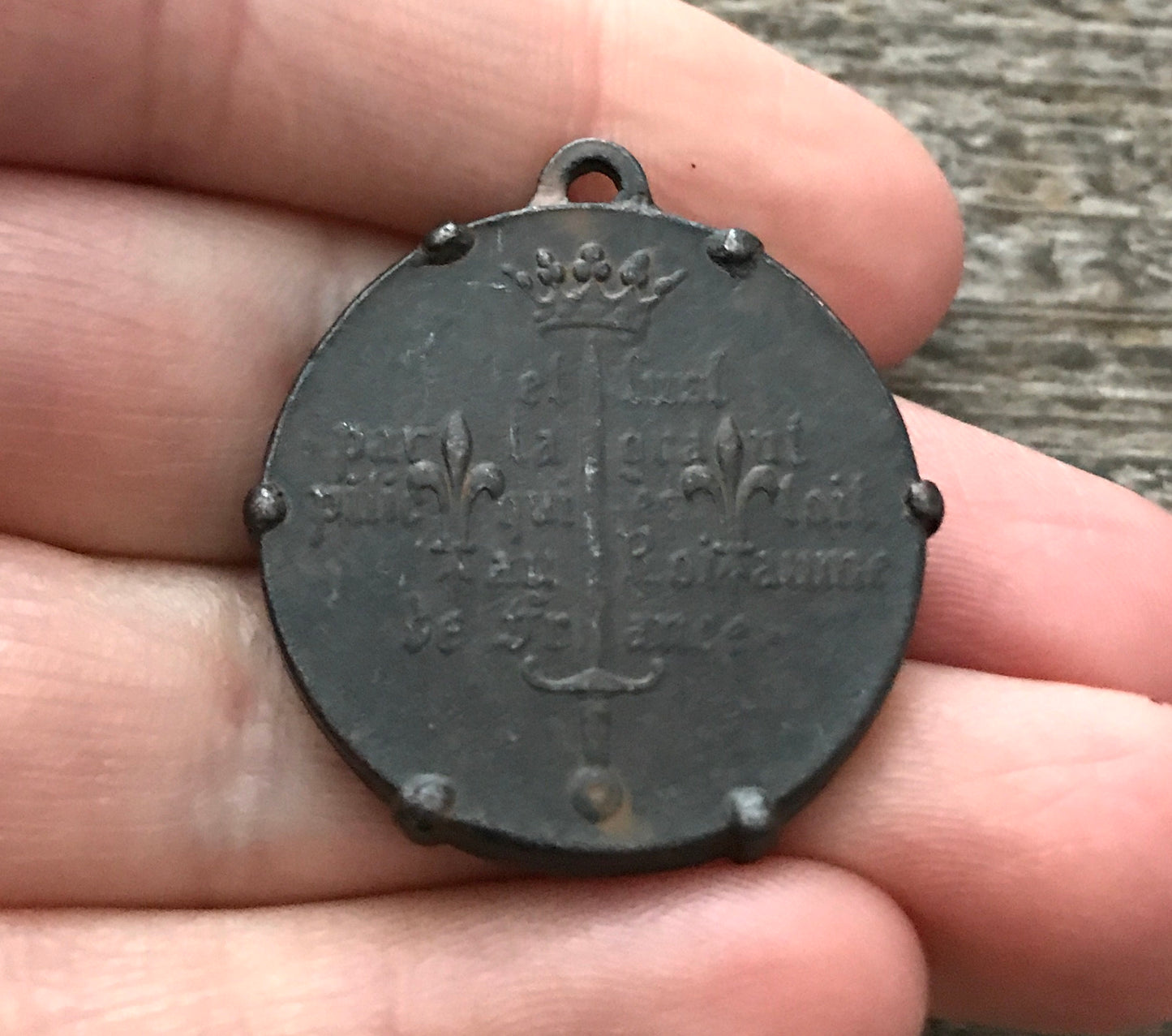 The back is written in French and translates to: “There is great pity in the kingdom of France.” That is what the Archangel St. Michael told Joan of Arc in the year 1429. Here is a brief history from history.com about Joan of Arc: "Joan of Arc, a peasant girl living in medieval France, believed that God had chosen her to lead France to victory in its long-running war with England.