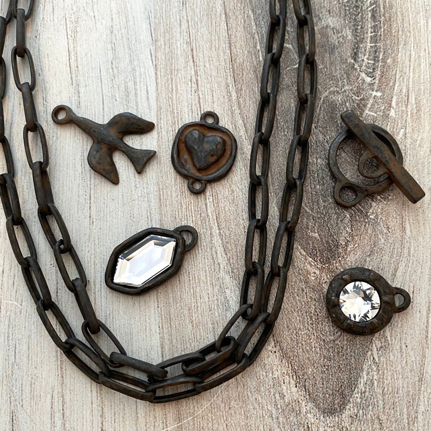 CC pewter components are made of high-quality pewter that is free of lead and cadmium. Most CC chain is made of regular steel, and some is made of brass. It is then plated with the various CC finishes. CC plating is known to hold up very well over time, but as always with any plated items, we recommend keeping it away from water and perfume.