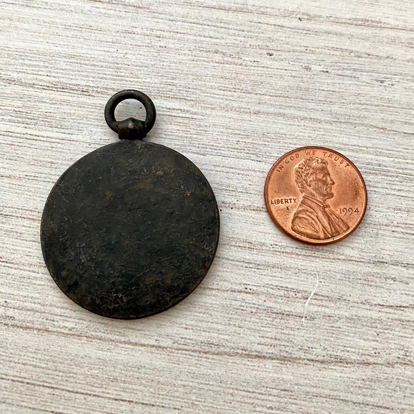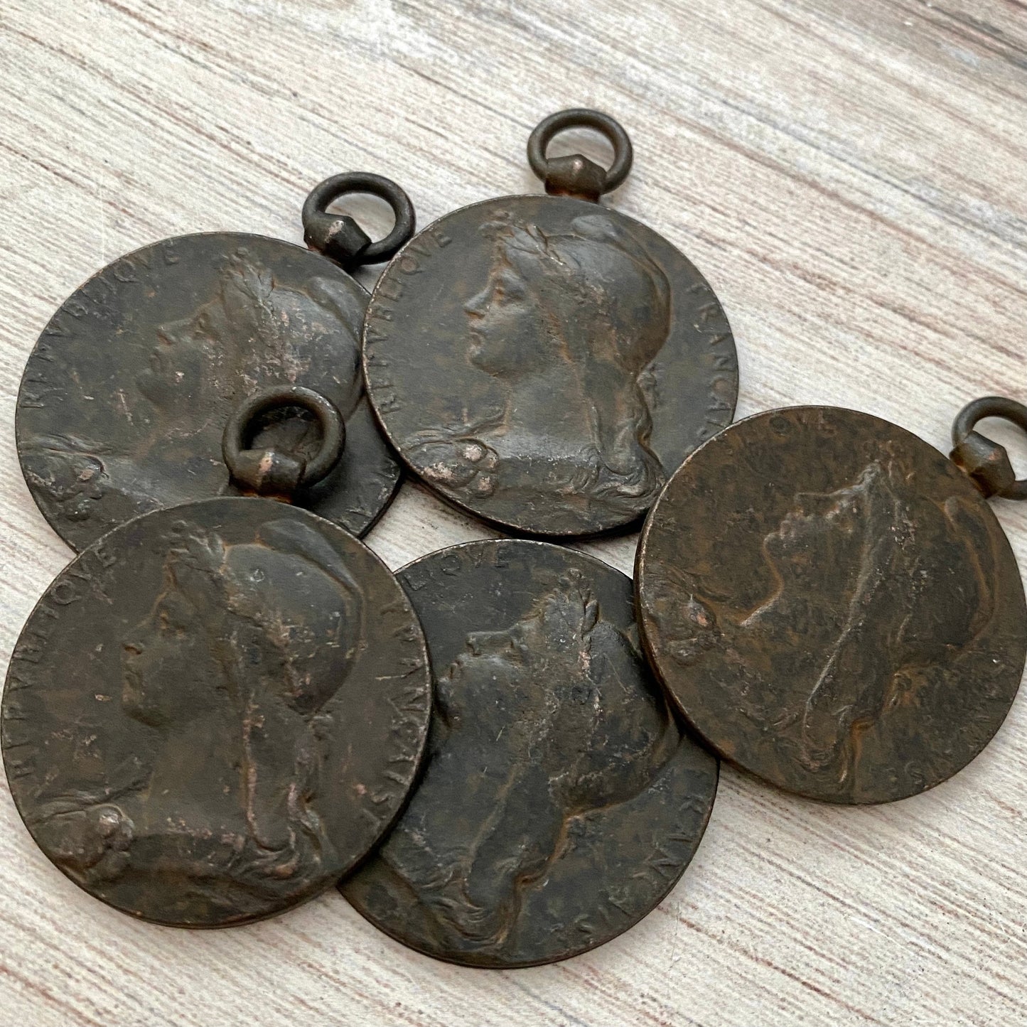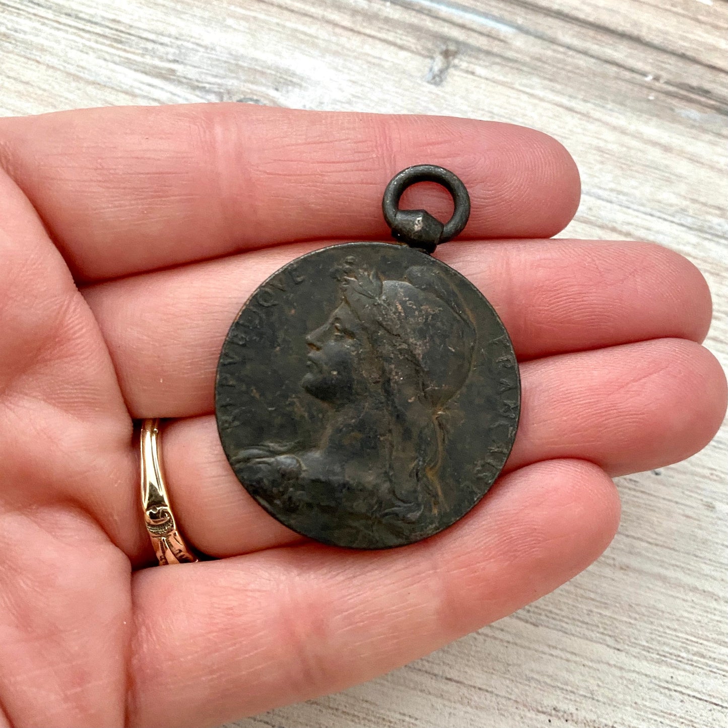 This French medal replica depicts Marianne, who is the personification of the French Republic since the revolution. She stands for liberty, equality, and reason. Similar to the American Statue of Liberty, she is a portrayal of the Goddess of Liberty. This medal is large, and it's excellent for a long necklace, or a short statement necklace. The writing says, "Republique Francaise."