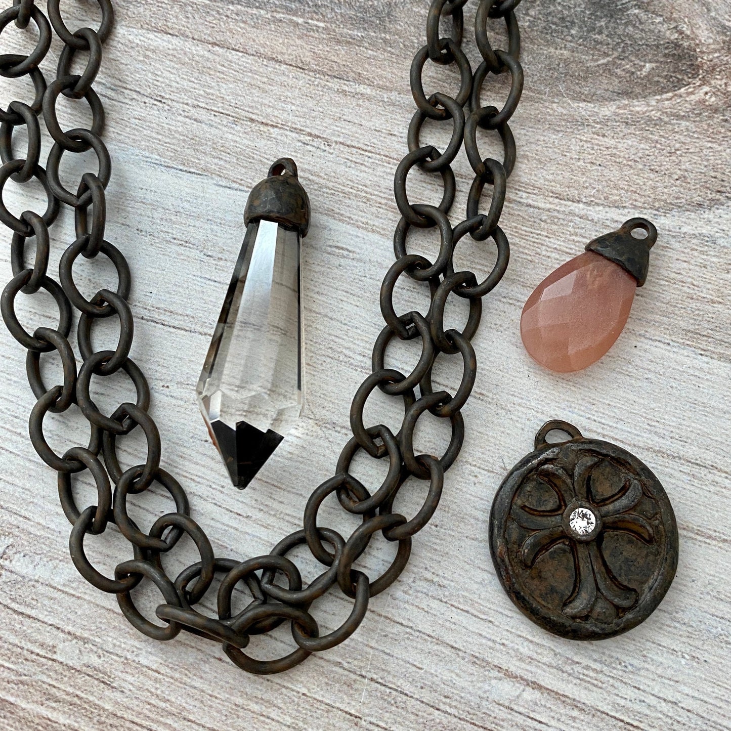 CC pewter components are made of high-quality pewter that is free of lead and cadmium. Most CC chain is made of regular steel, and some is made of brass. It is then plated with the various CC finishes. CC plating is known to hold up very well over time, but as always with any plated items, we recommend keeping it away from water and perfume.