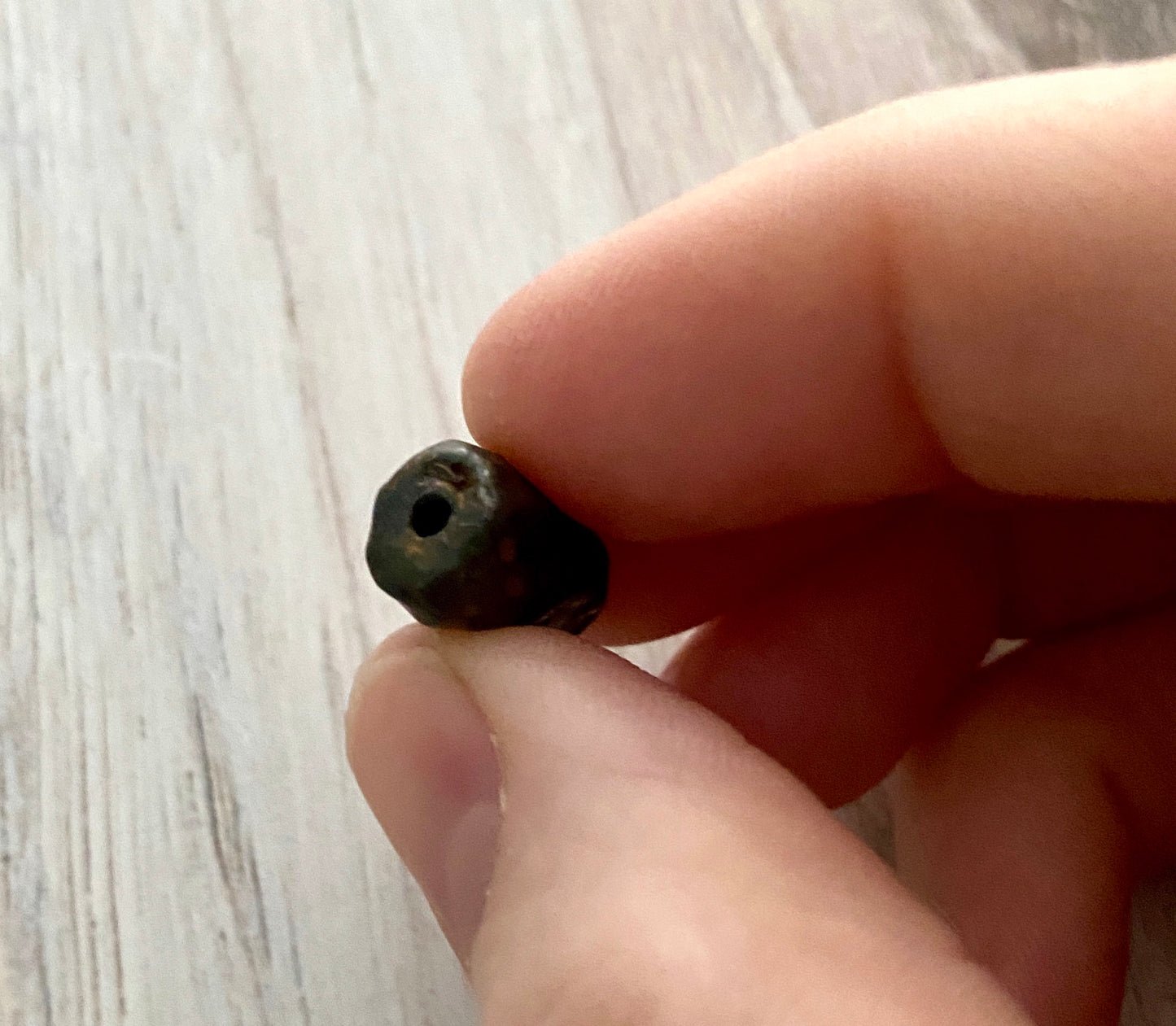 I made this bead to feel organic and textured. It's solid with the exception of the hole, which allows for elastic, wire, or leather (1mm - 1.5mm). This bead looks fabulous on a beaded bracelet.