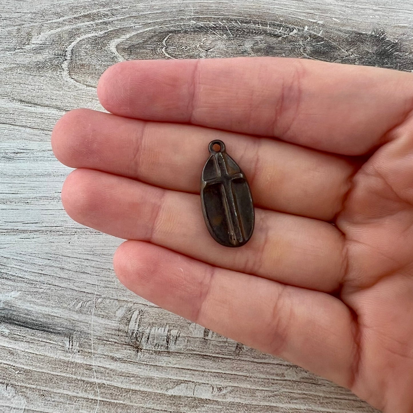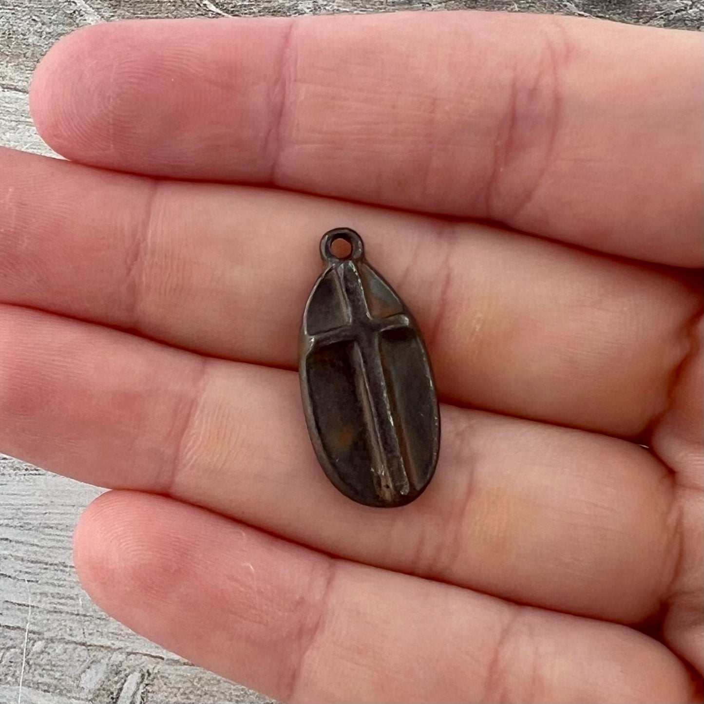 This cross charm is perfect for creating unique charm necklaces, bracelets, or earrings. Its sleek oval shape adds a modern touch to any jewelry design.