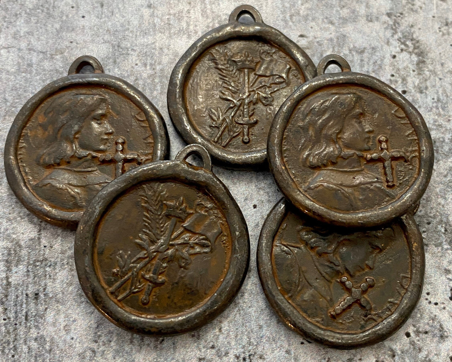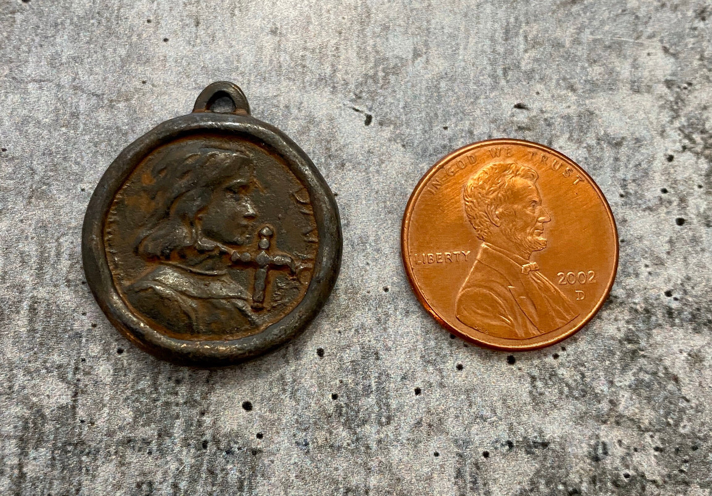 This unique and lovely soldered medal depicts Joan of Arc. I love her as a historical figure and saint because she was intently brave and lived a life that followed her convictions. She is known as the patron saint of soldiers. “There is great pity in the kingdom of France.” That is what the Archangel St. Michael told Joan of Arc in the year 1429.