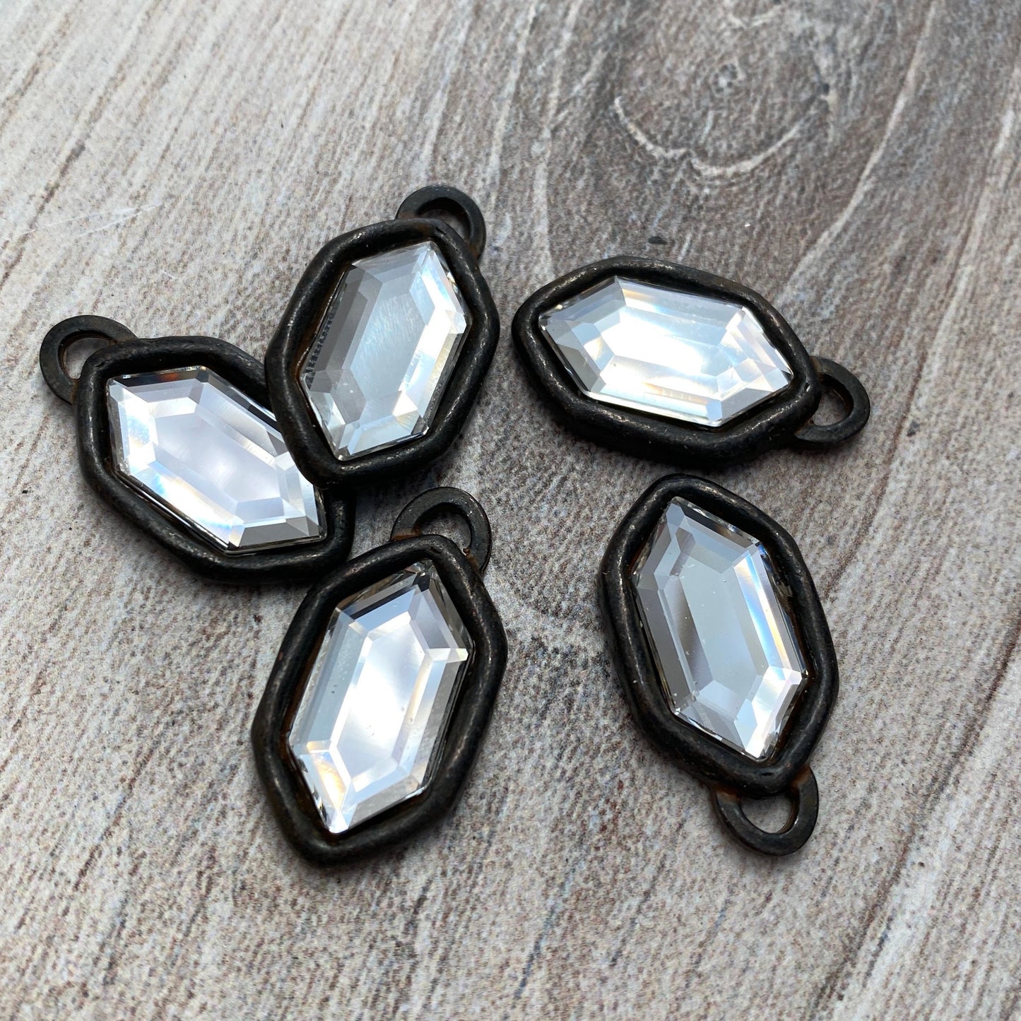 Swarovski Crystal Clear Hexagon Charm, Antiqued Rustic Brown Rhinestone Pendant, Jewelry Making Artisan Findings, BR-S013